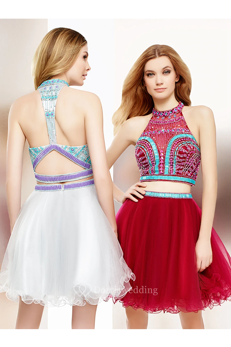 Short A-Line Sleeveless Beaded High Neck Tulle Cocktail Dress With Keyhole