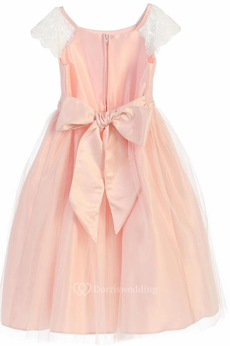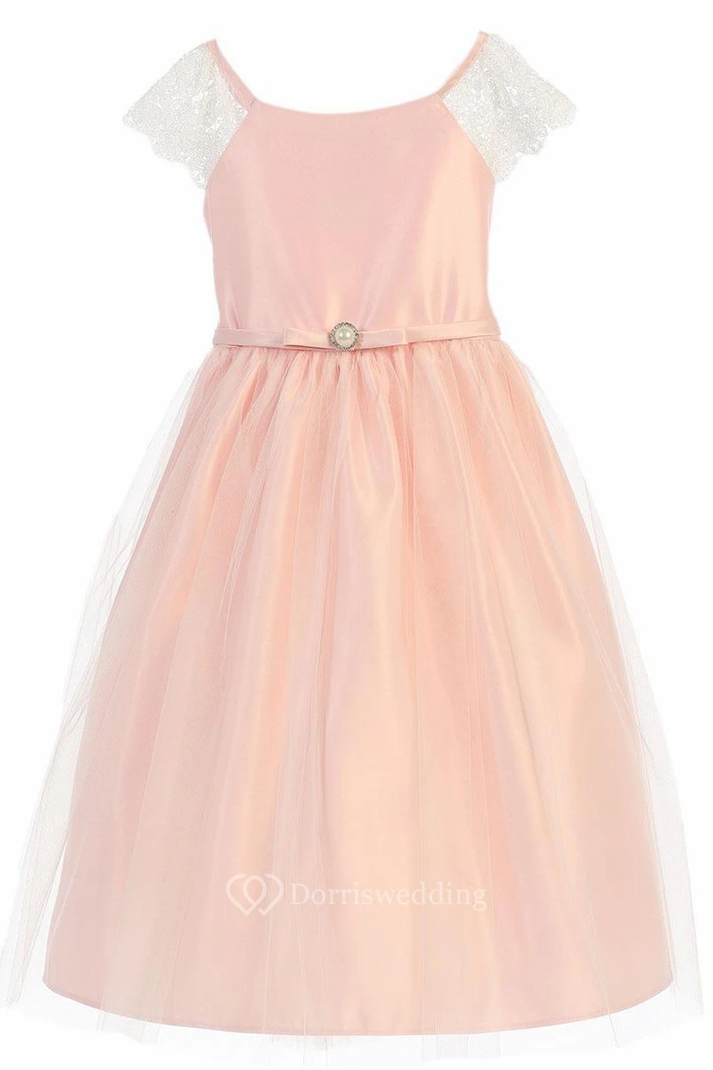 Short Broach Beaded Cap-Sleeve Tulle&Lace Flower Girl Dress