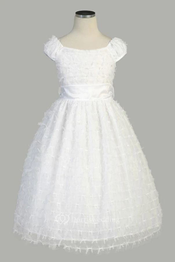 Short Cap-Sleeve Tiered Tulle&Taffeta Flower Girl Dress