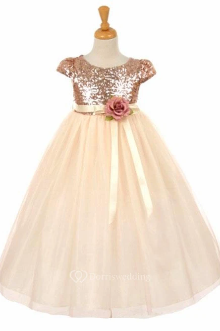 Short Floral Empire Floral Tulle&Sequins Flower Girl Dress With Sash