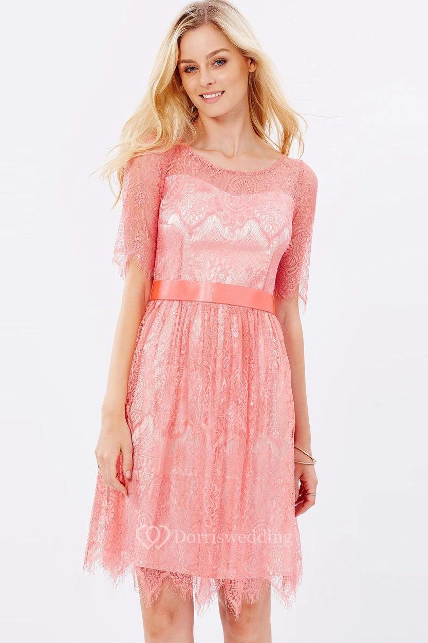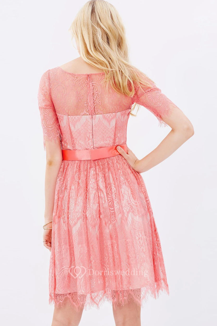 Short Half Sleeve Ribboned Scoop Neck Lace Bridesmaid Dress