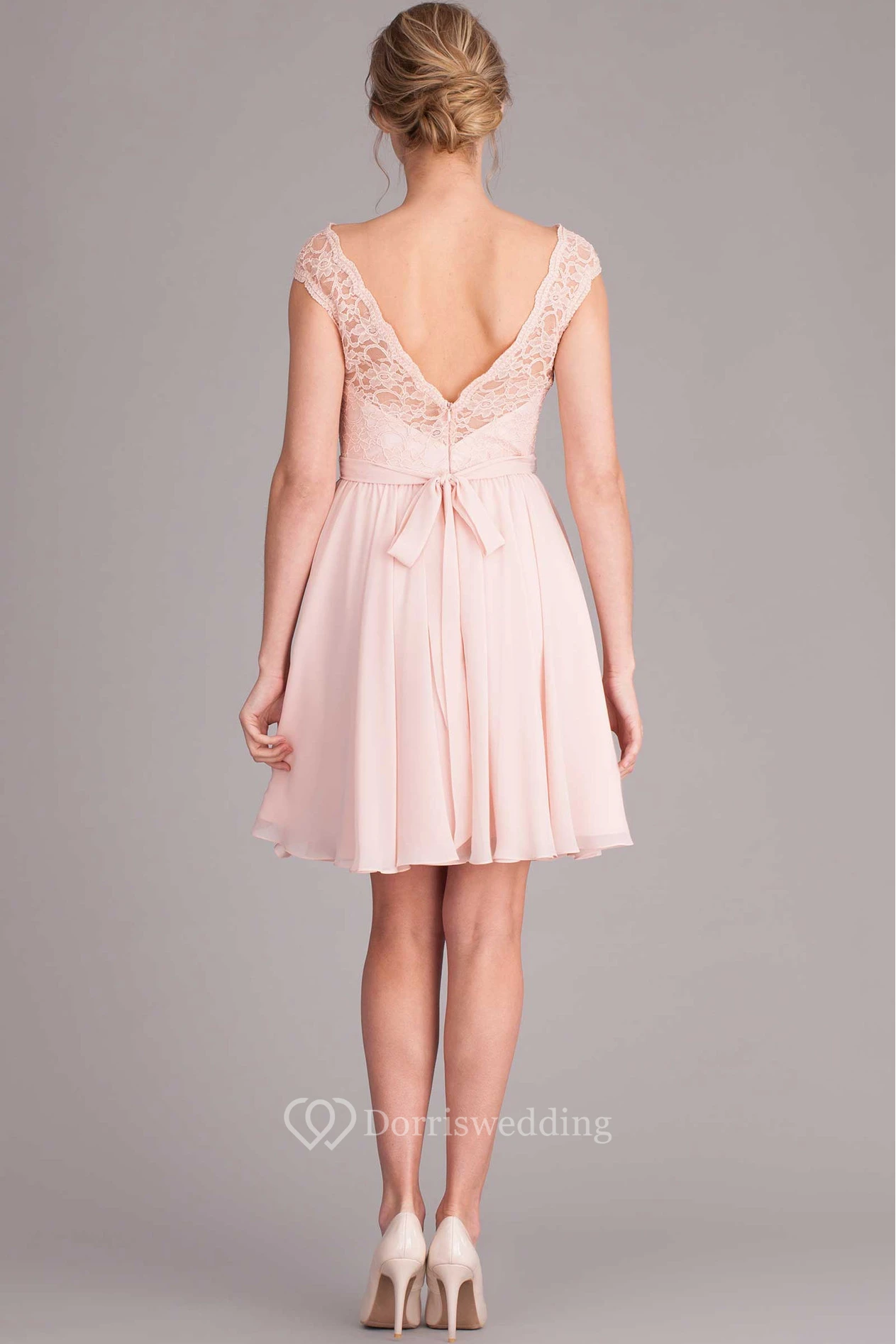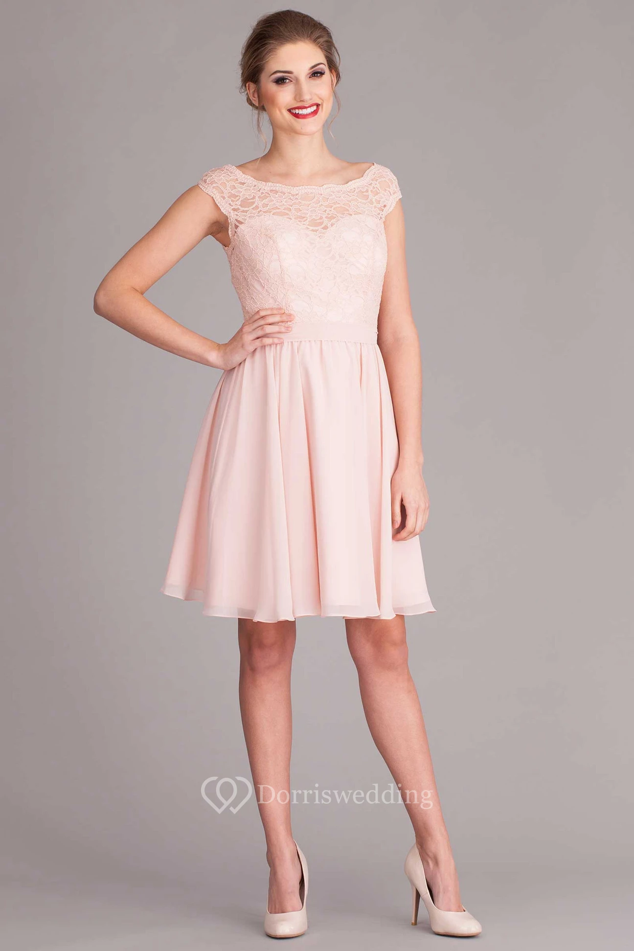 Short Scoop Cap-Sleeve Lace Chiffon Bridesmaid Dress With Pleats