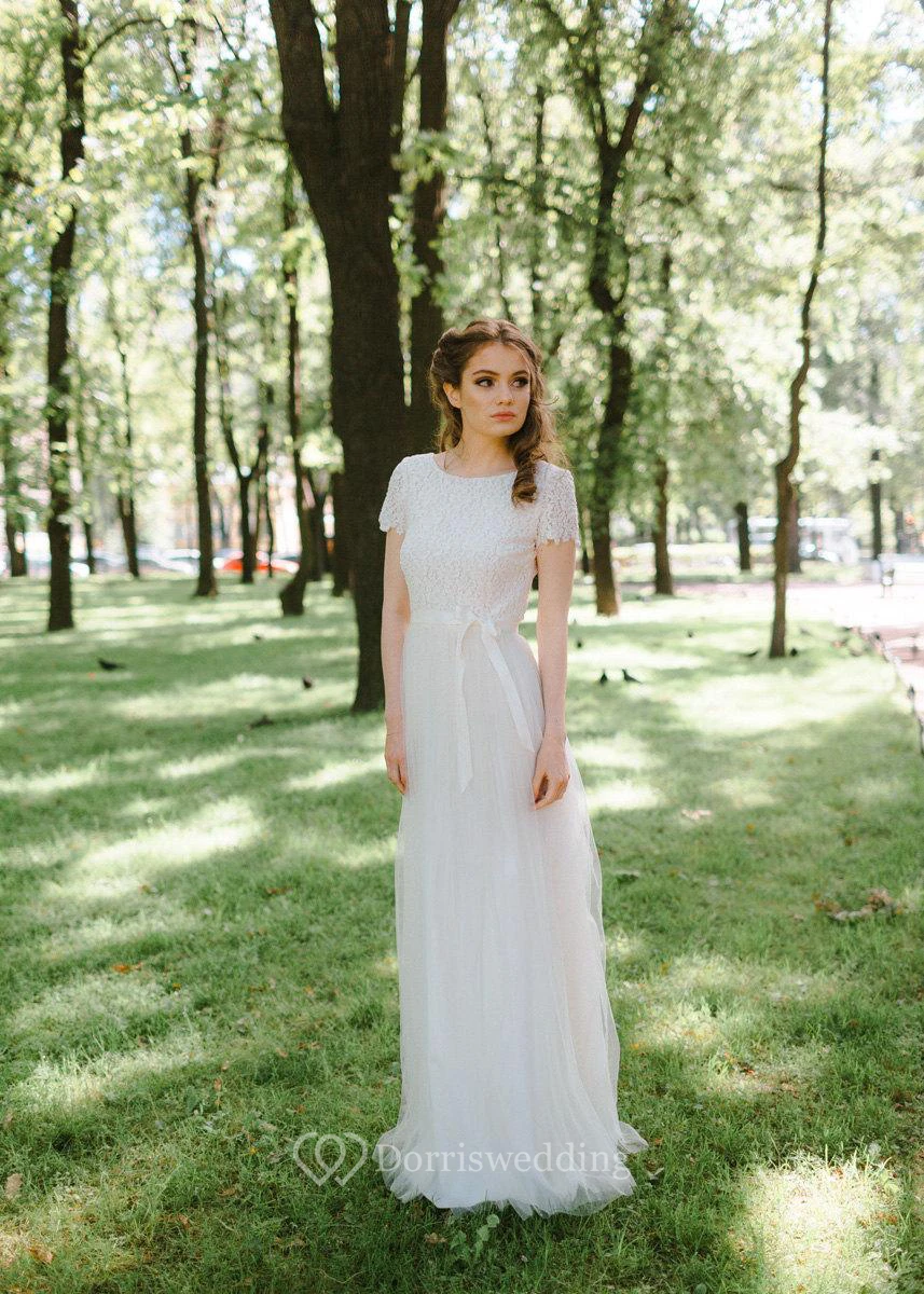 Short Sleeve Jewel Neck Tulle Long Gown With Low-V Back