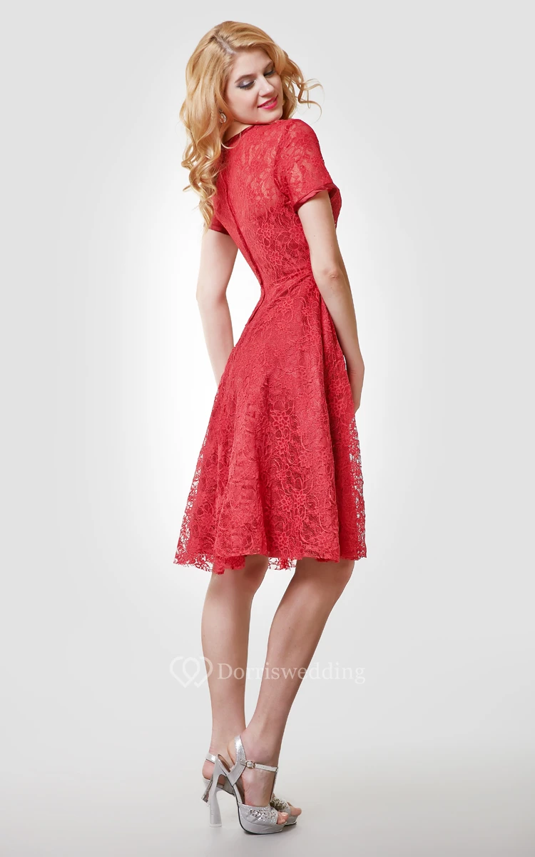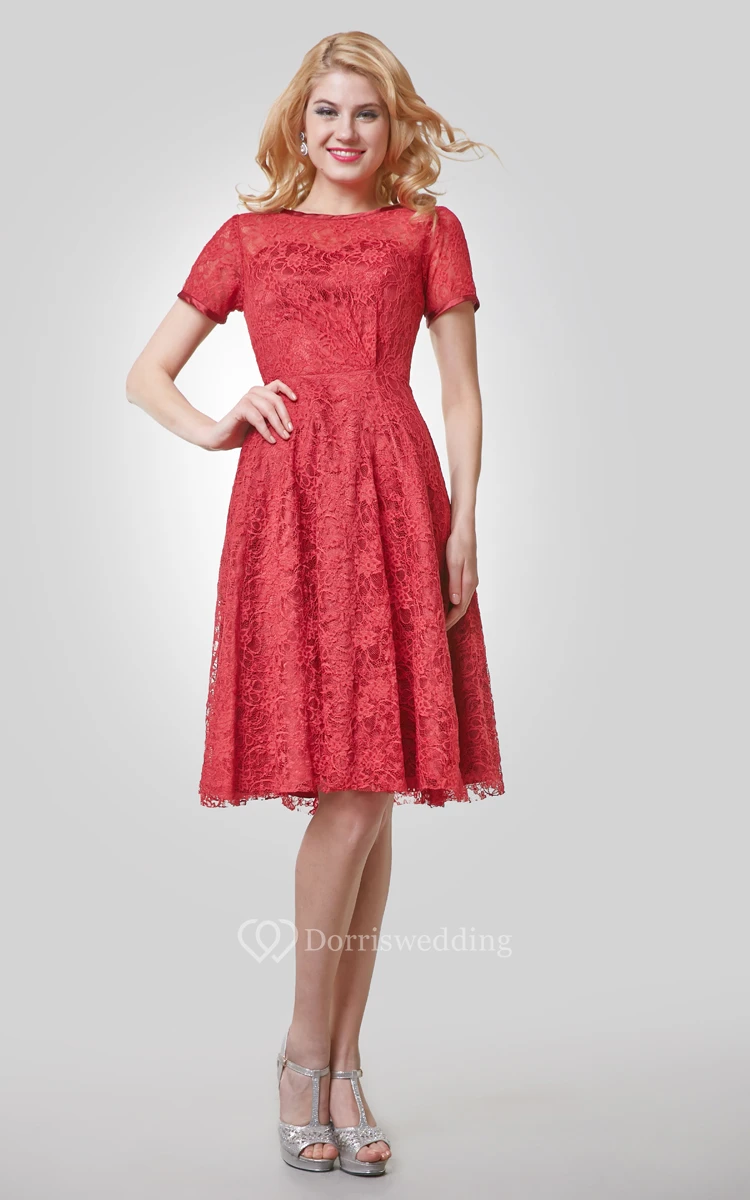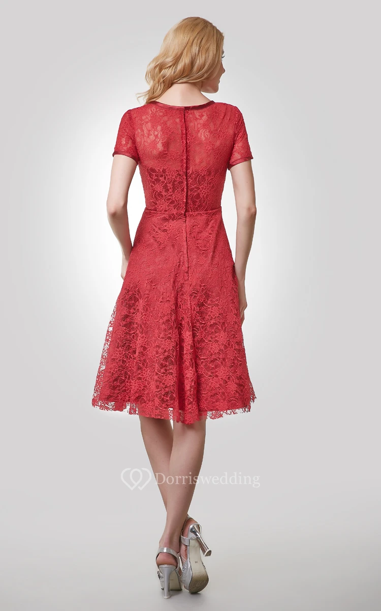 Short Sleeve Knee Length Lace A-Line Dress With Bateau Neck