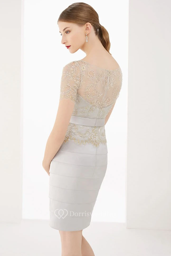 Short Sleeve Knee Length Satin Dress With Layered Skirt And Flower Sash