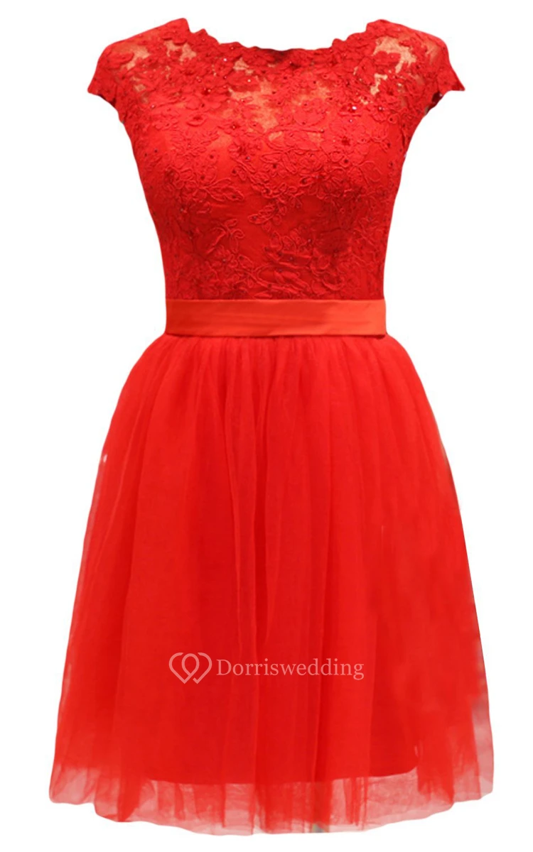 Short-sleeve Lace Bodice Dress With Satin Sash