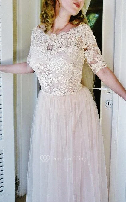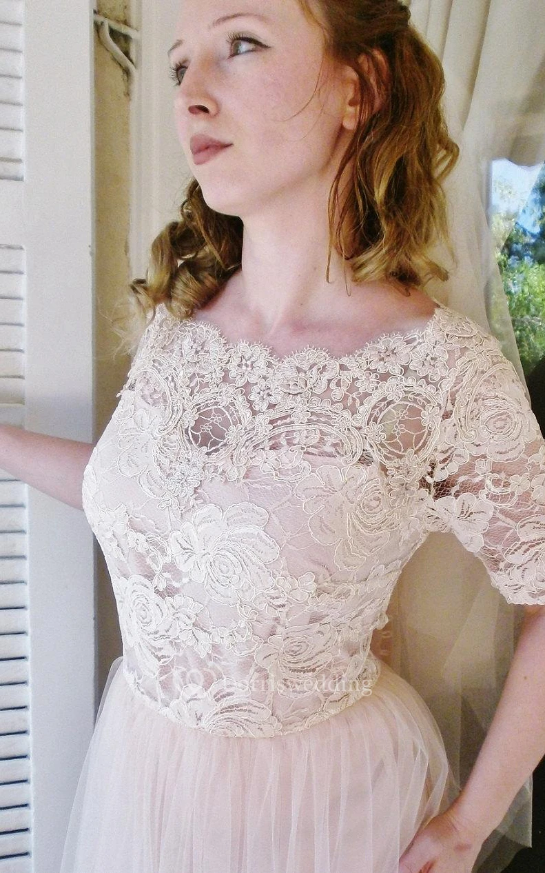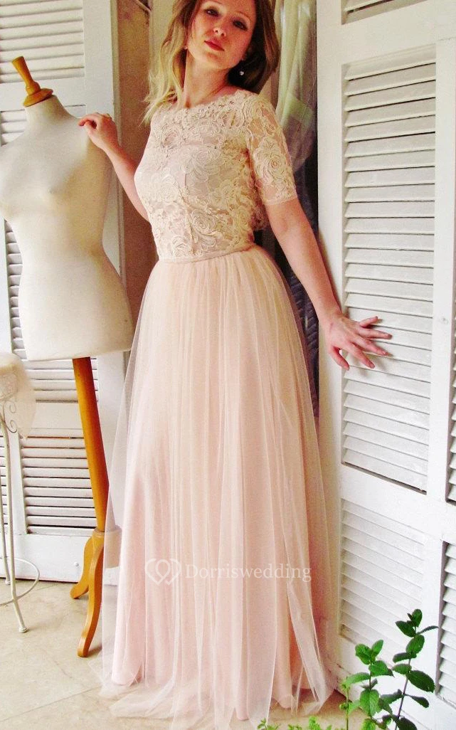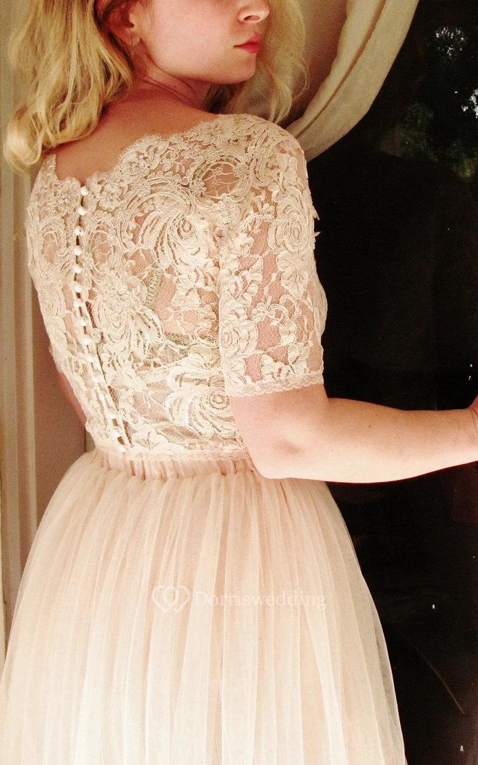 Short Sleeve Lace-Bodice Tulle Dress With Scalloped Bateau Neck and Pleated Skirt