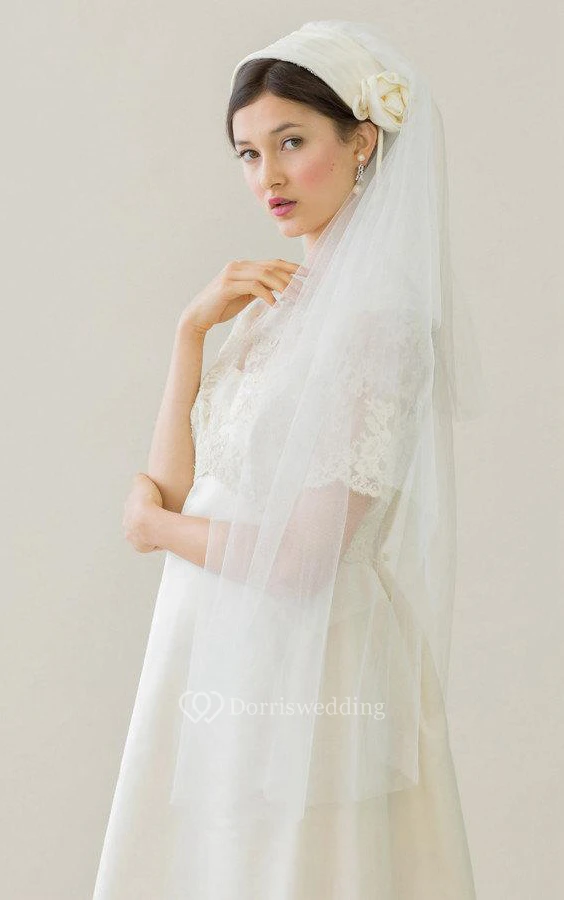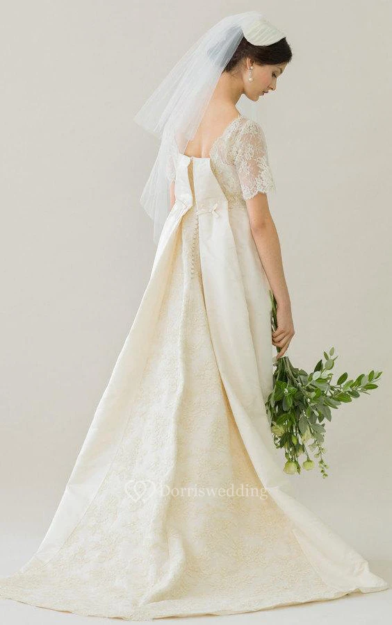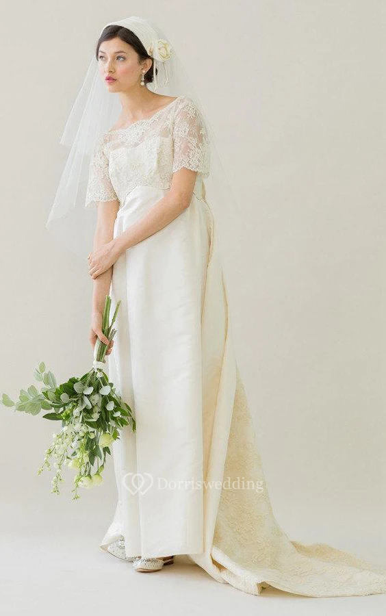 Short Sleeve Satin and Lace A-Line Dress With Watteau Train