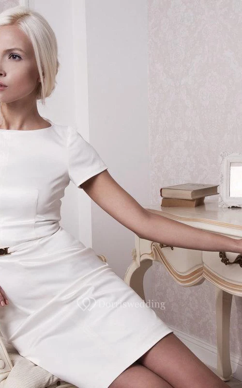 Short Sleeve Sheath Satin Dress With Jewel Neckline