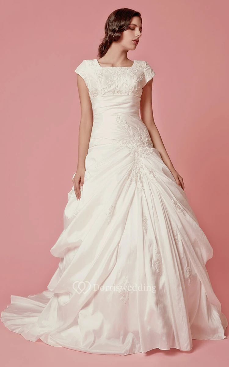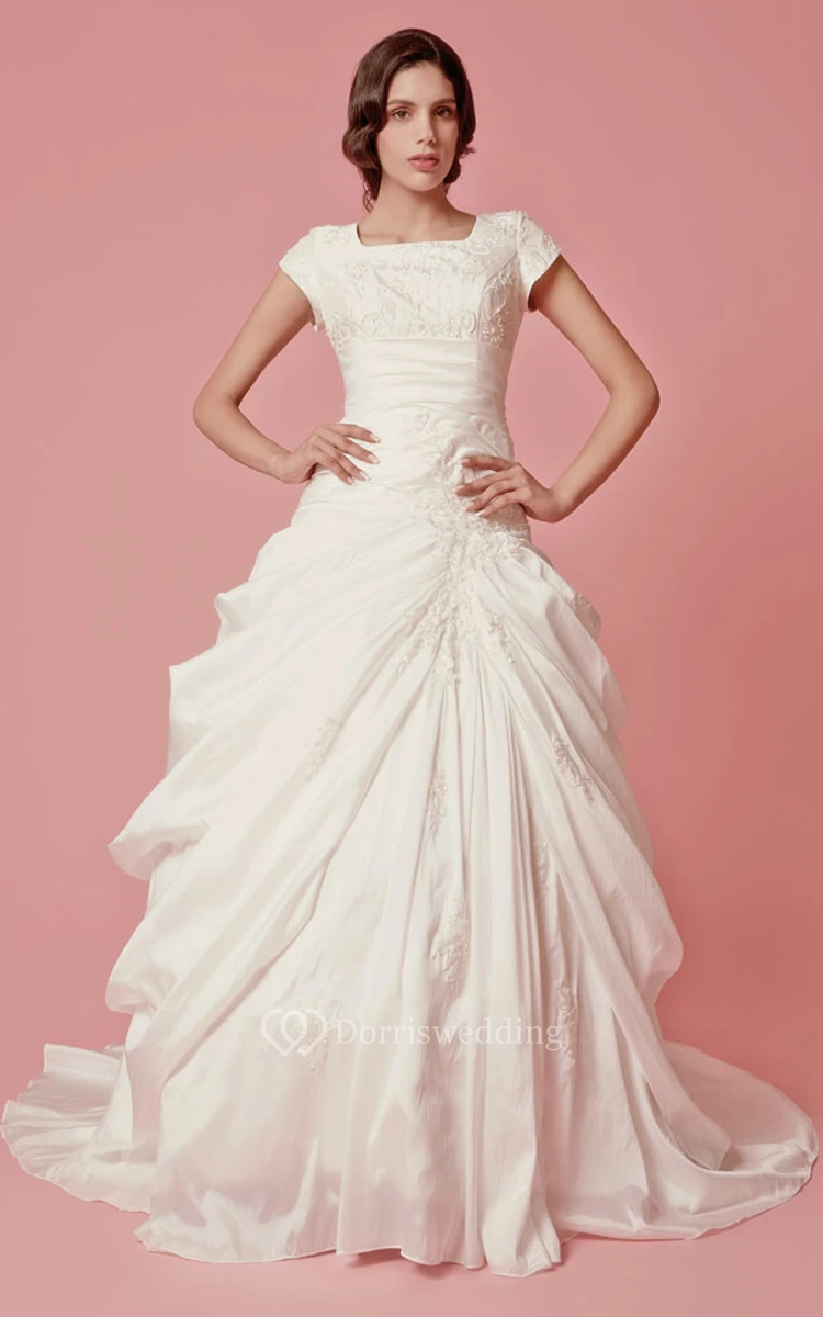 Short Sleeve Square Neck Dropped Satin Gown With Embroidery