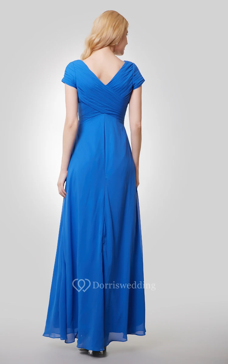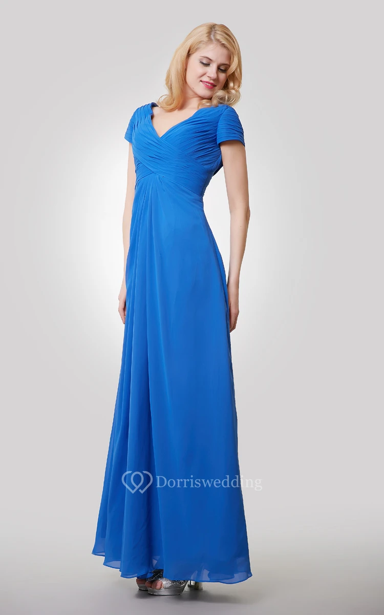 Short Sleeve V-Neck A-Line Chiffon Dress With Crisscross Ruching
