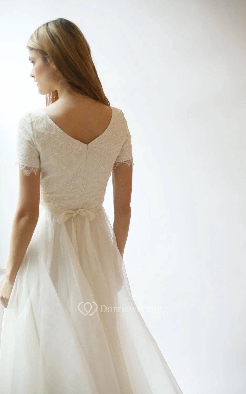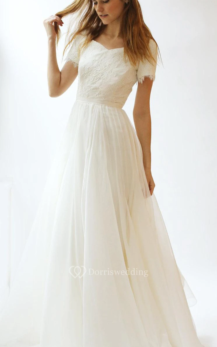 Short Sleeve V-Neck A-Line Lace and Tulle Dress With Pleats