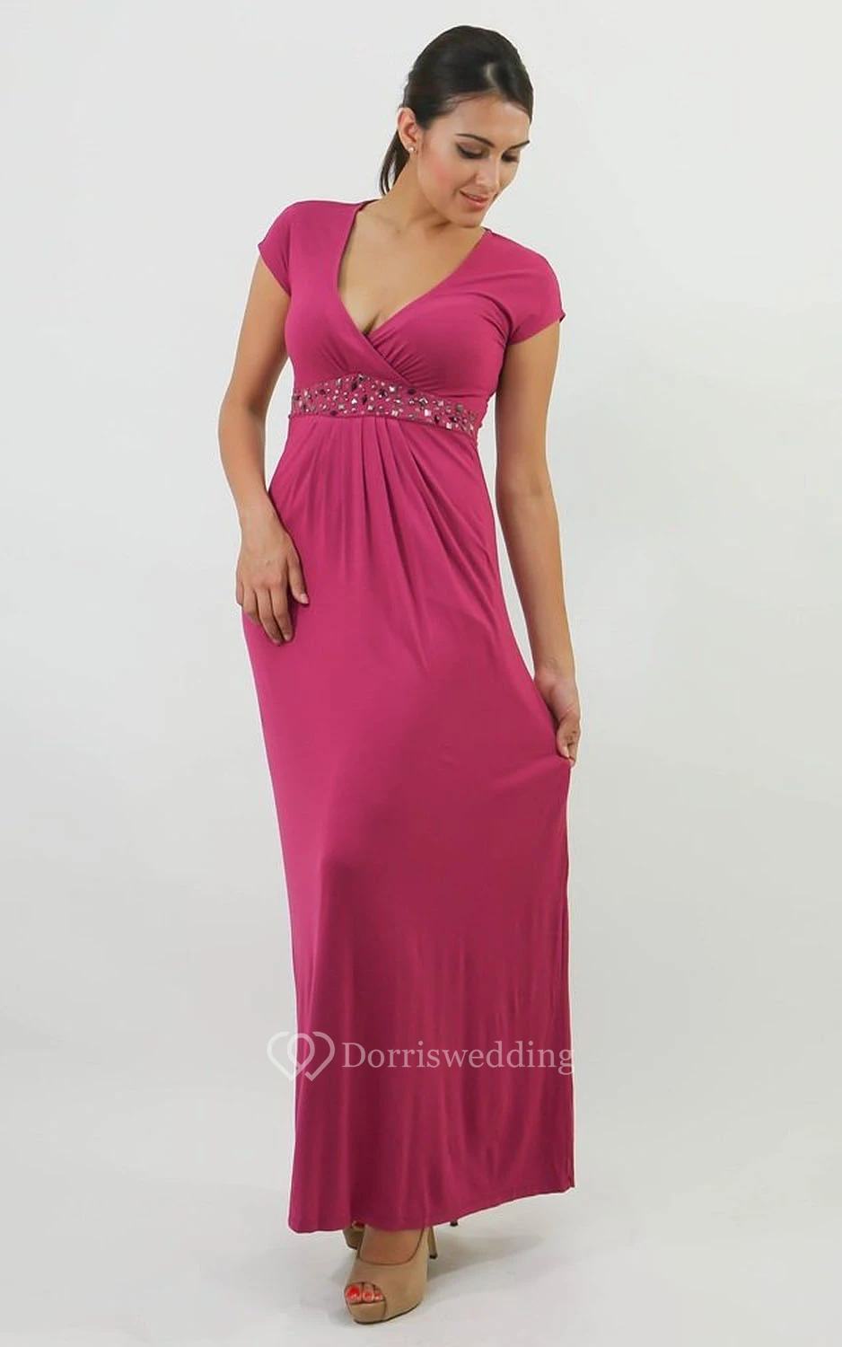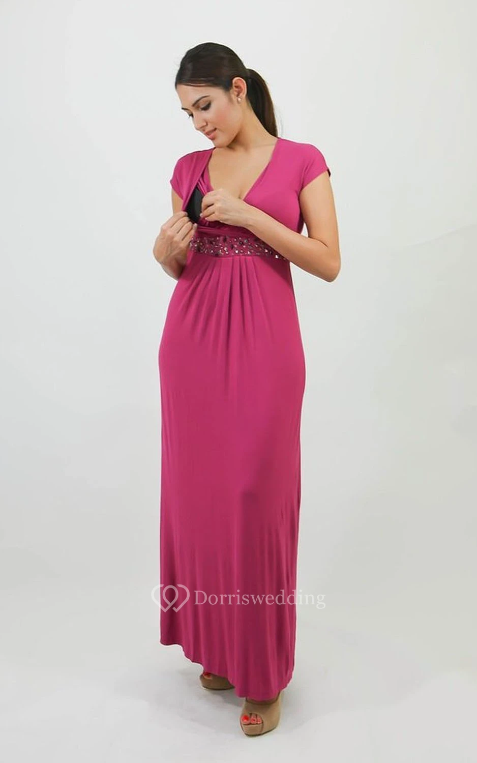 Short Sleeve V-neck Beaded Waistband Long Satin Dress
