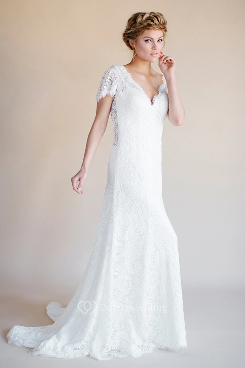 Short-Sleeve V-Neck Lace Wedding Dress With Backless Design