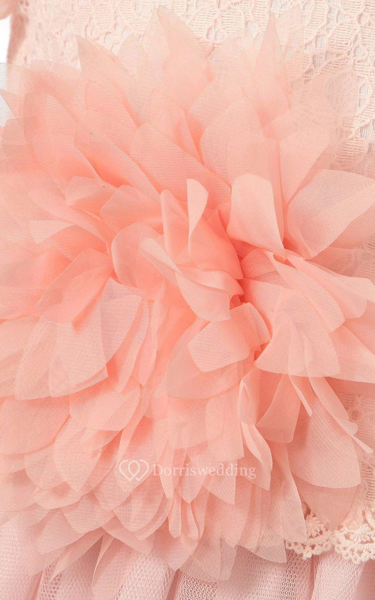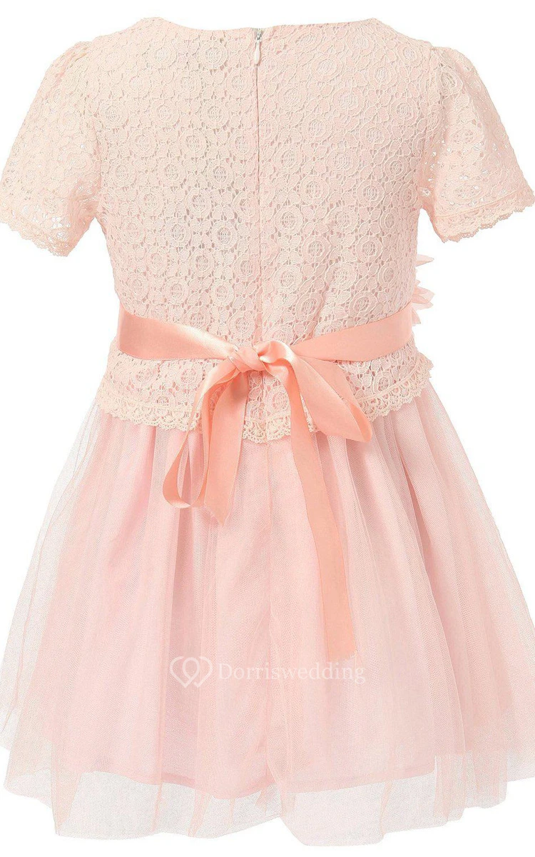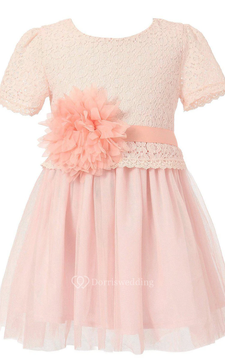 Short-sleeved A-line Lace Dress With Flower and Pleats