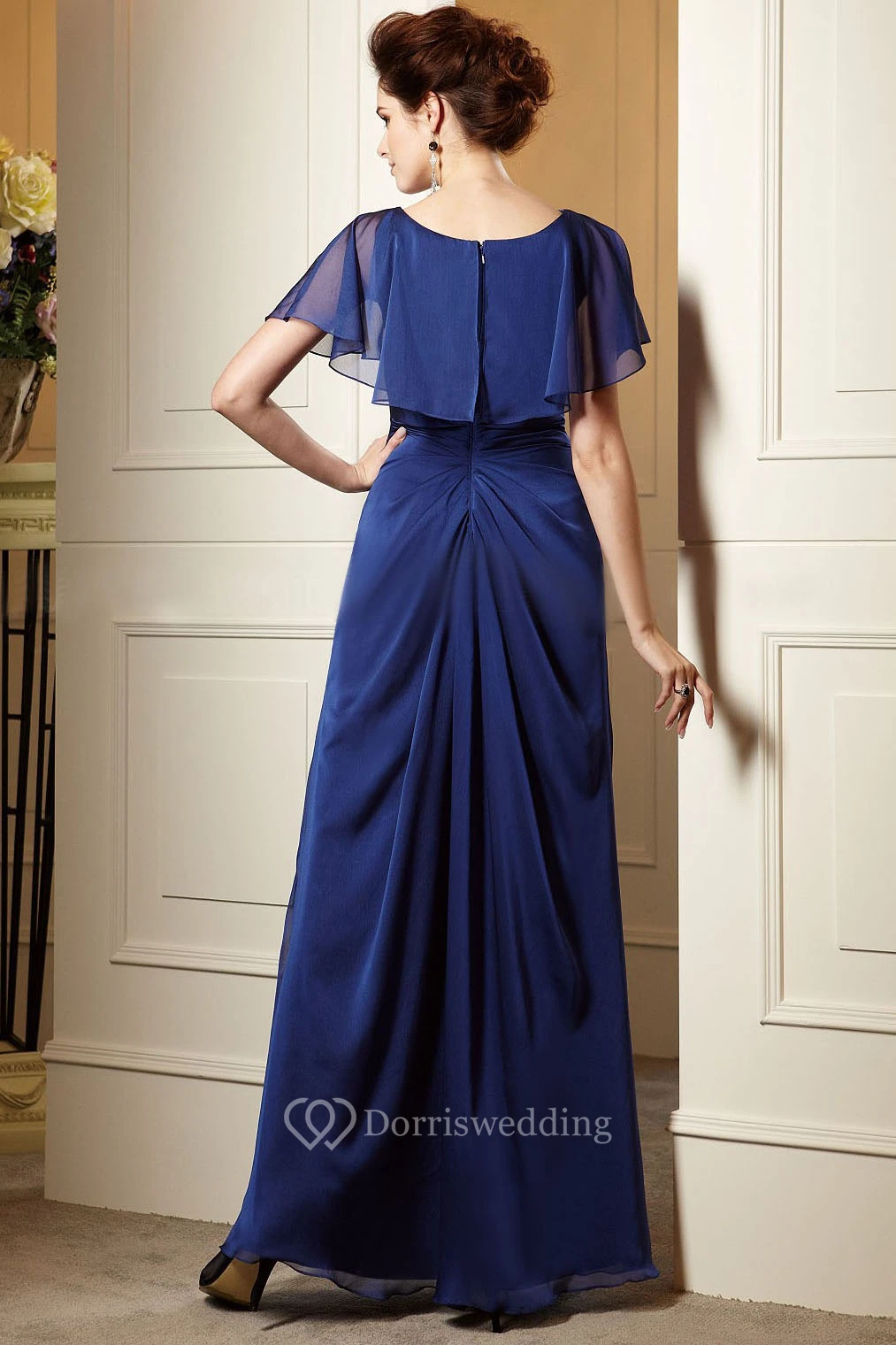 Short-Sleeved A-Line Long Mother Of The Bride Dress With Beadings And Ruffles
