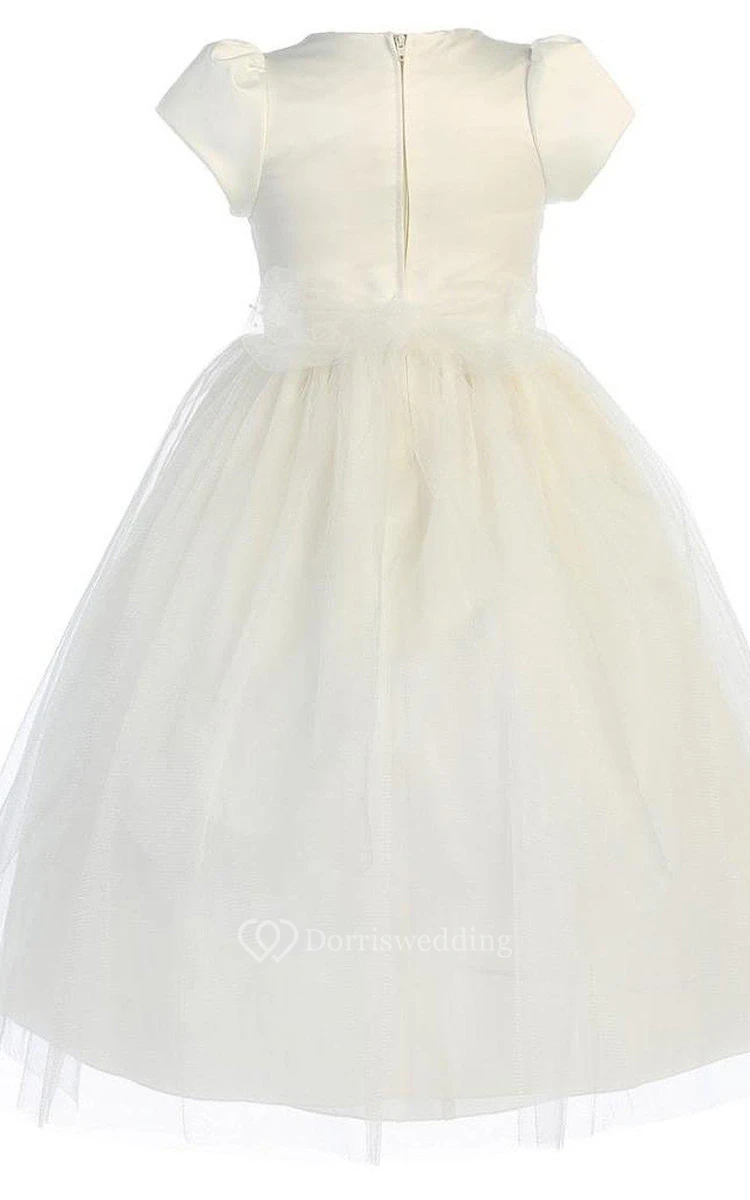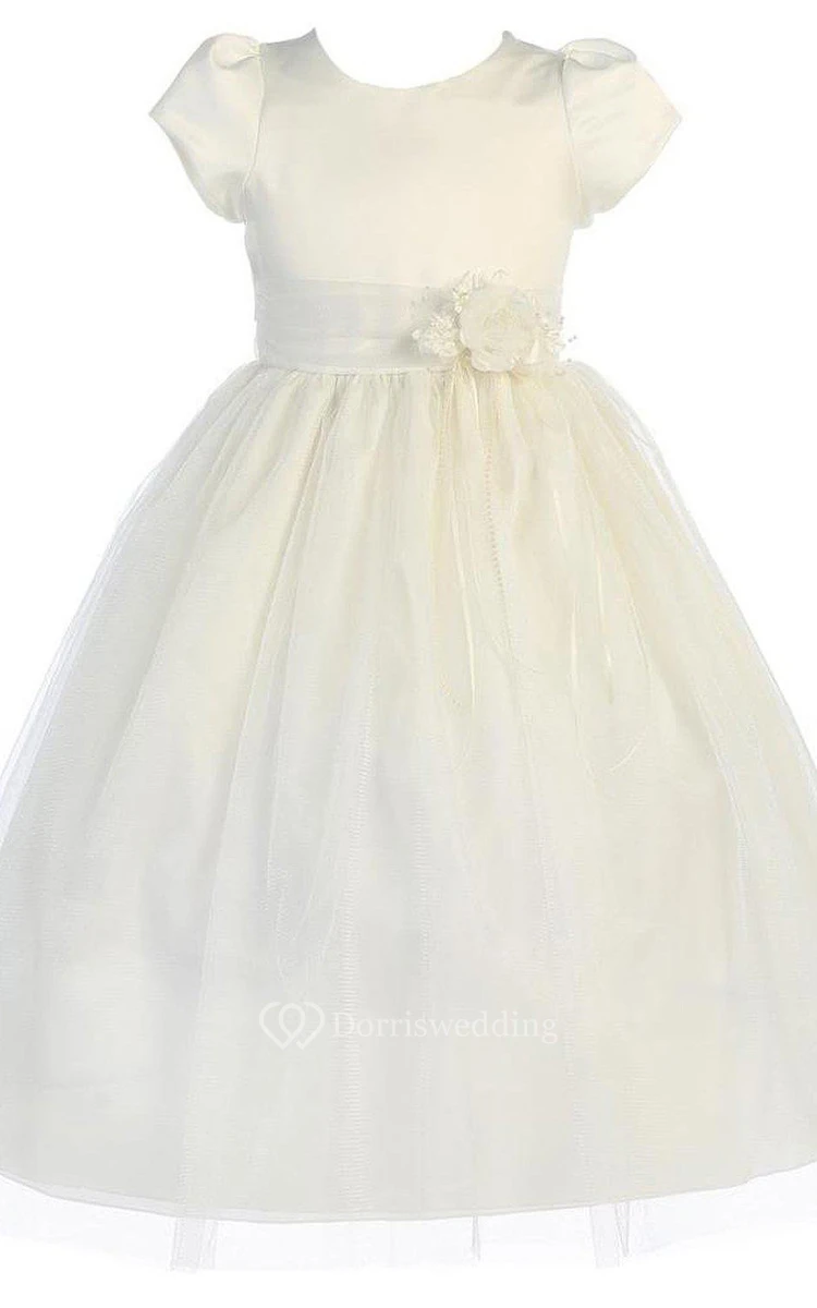 Short-sleeved A-line Pleated Dress With Flower and Bow