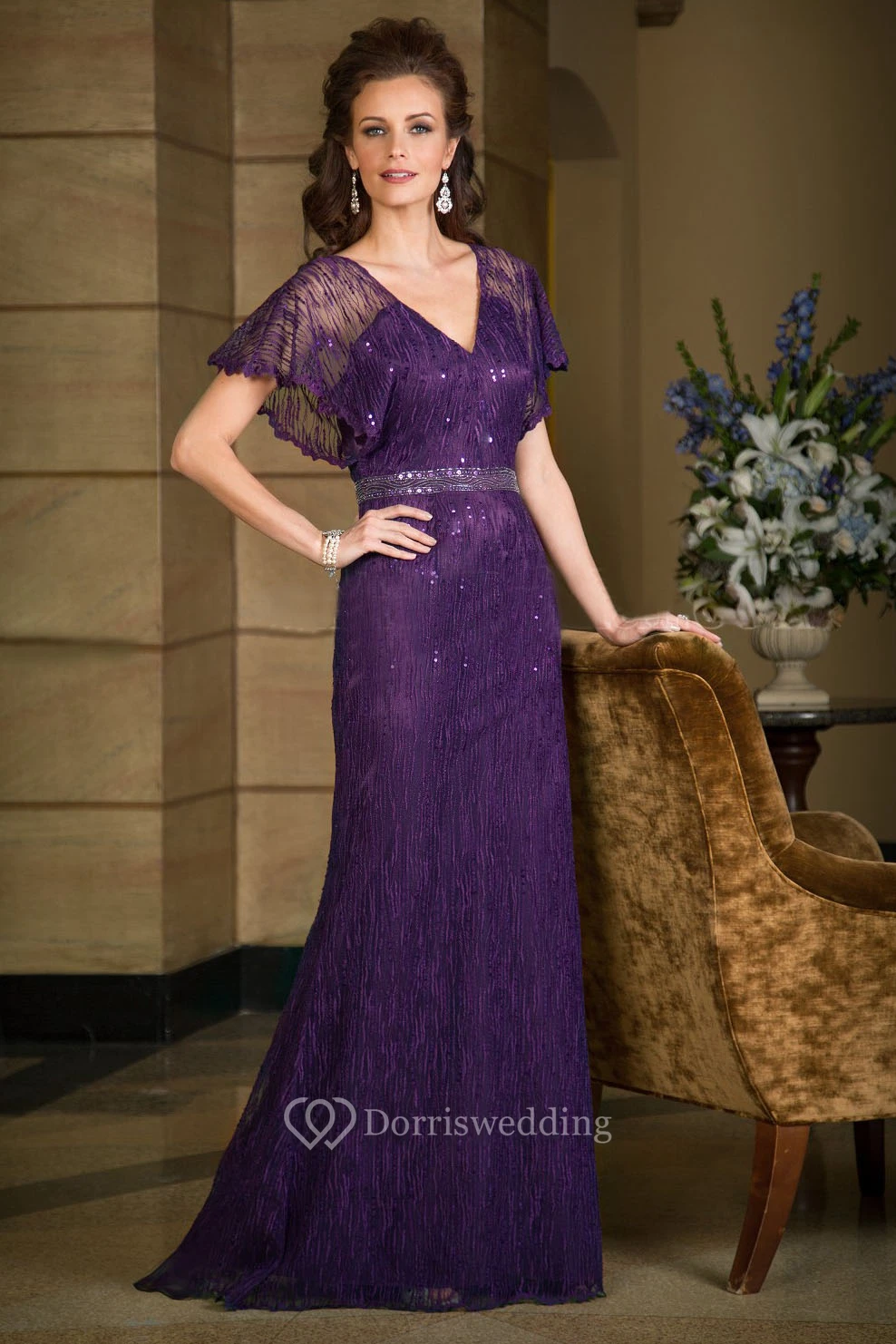 Short-Sleeved V-Neck Long Mother Of The Bride Dress With Sequins And V-Back