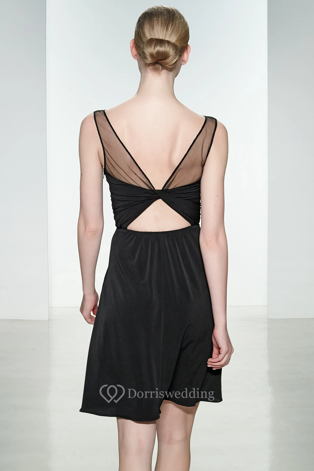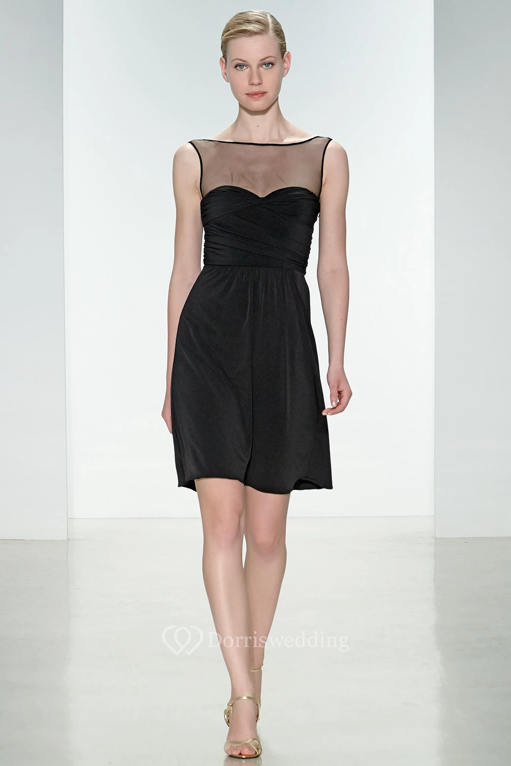 Short Sleeveless Bateau Neck Ruched Chiffon Bridesmaid Dress With Illusion Back