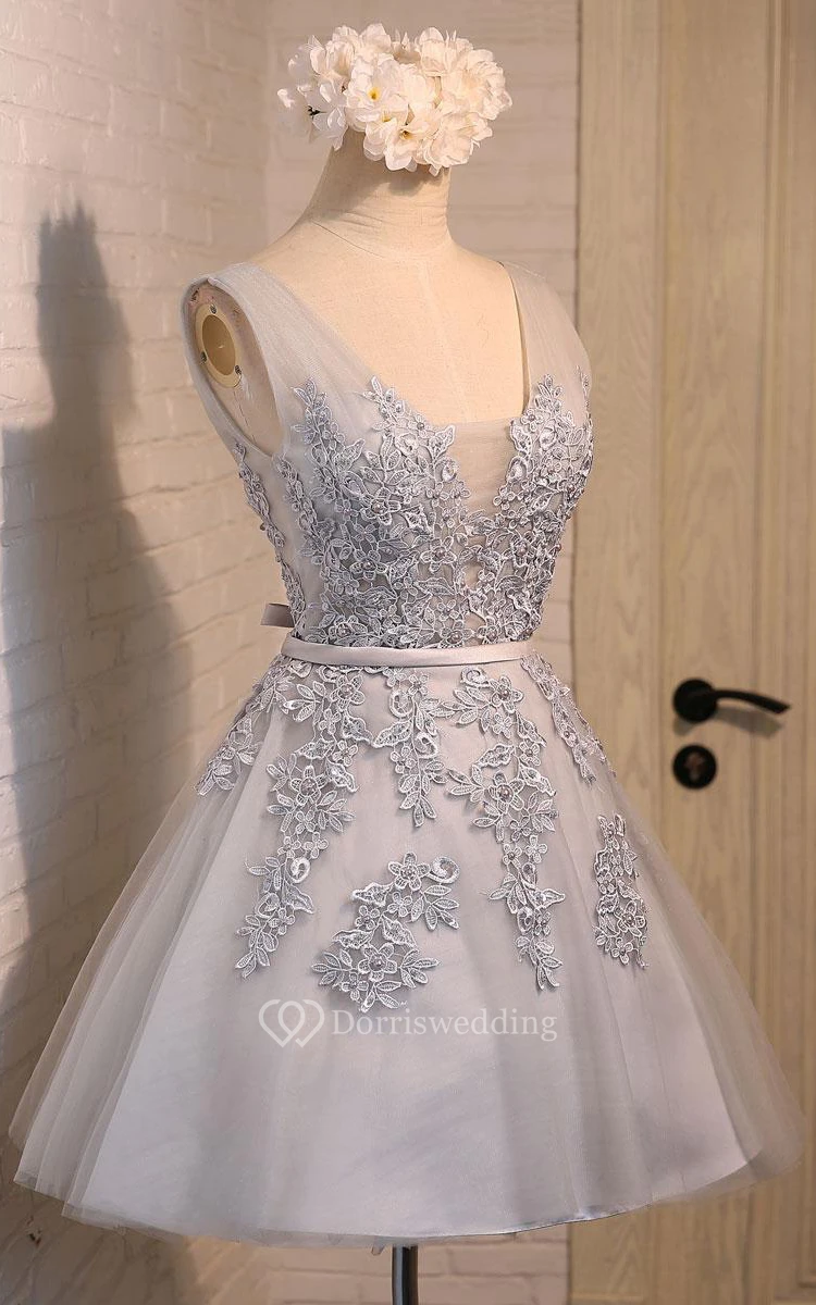 Short V-neck Bow Beading Appliques Tulle Lace Dress