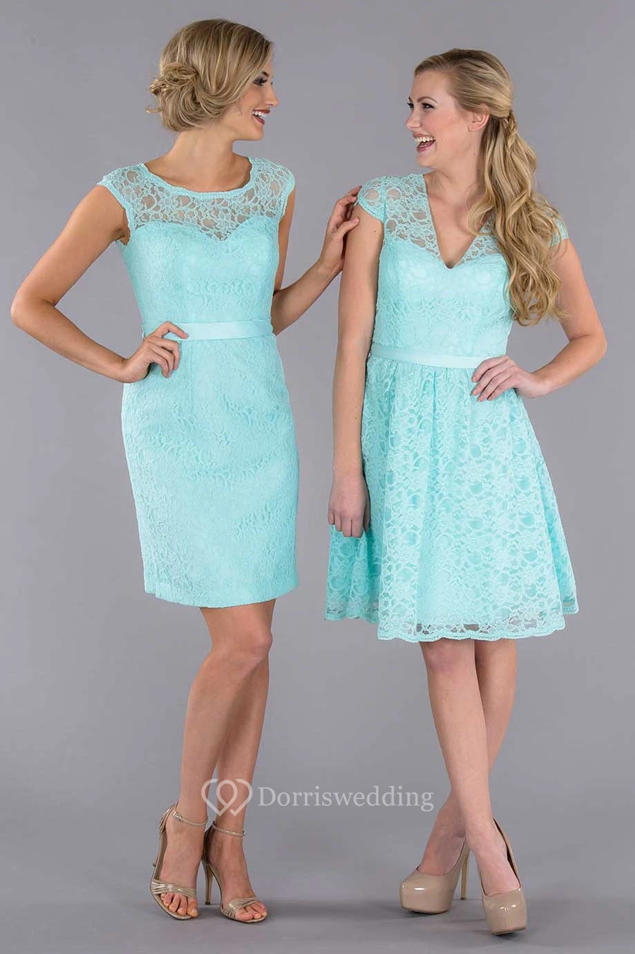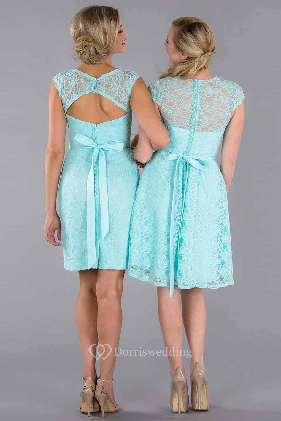 Short V-Neck Cap Sleeve Ribboned Lace Bridesmaid Dress With Keyhole