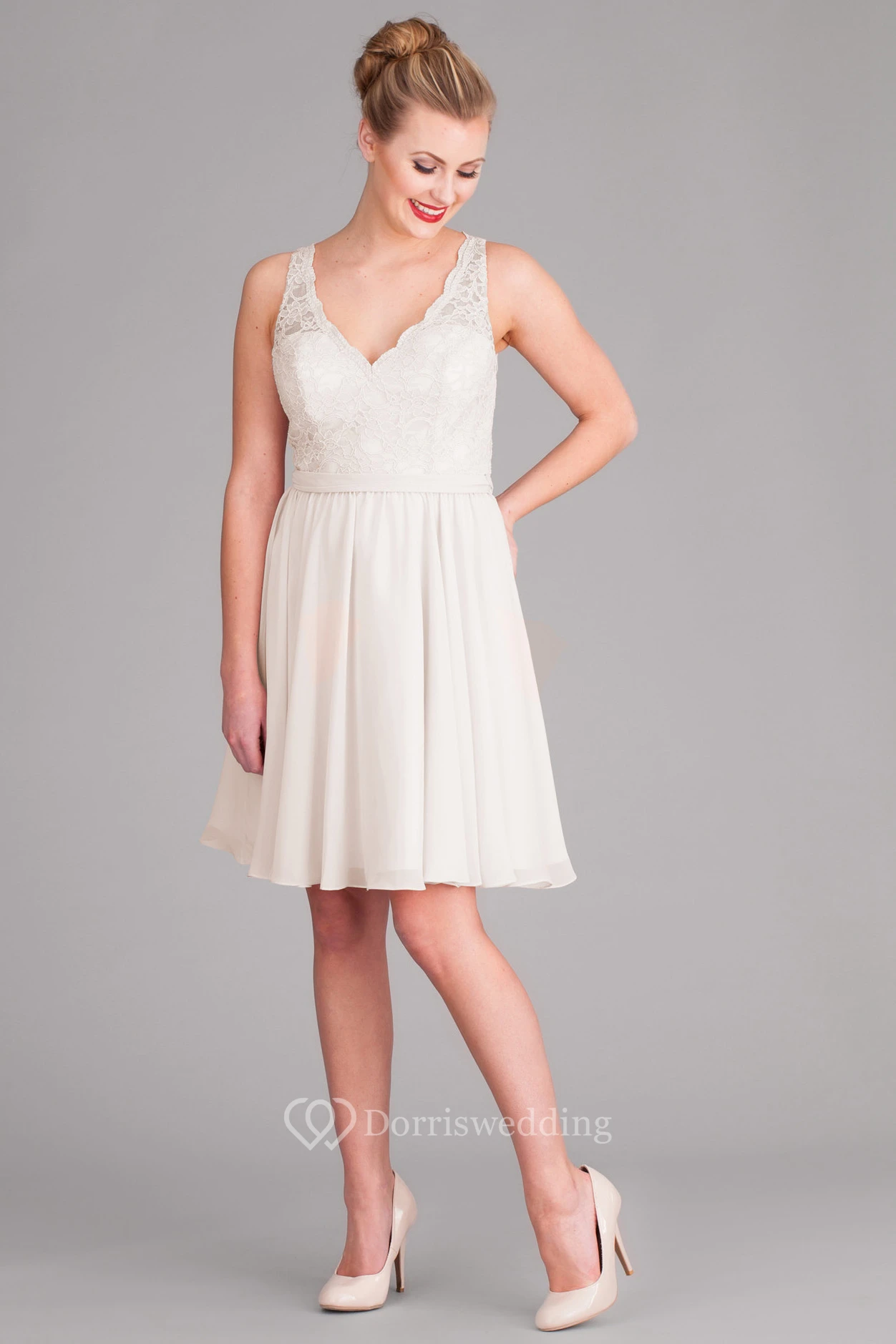Short V-Neck Sleeveless Lace Chiffon Wedding Dress