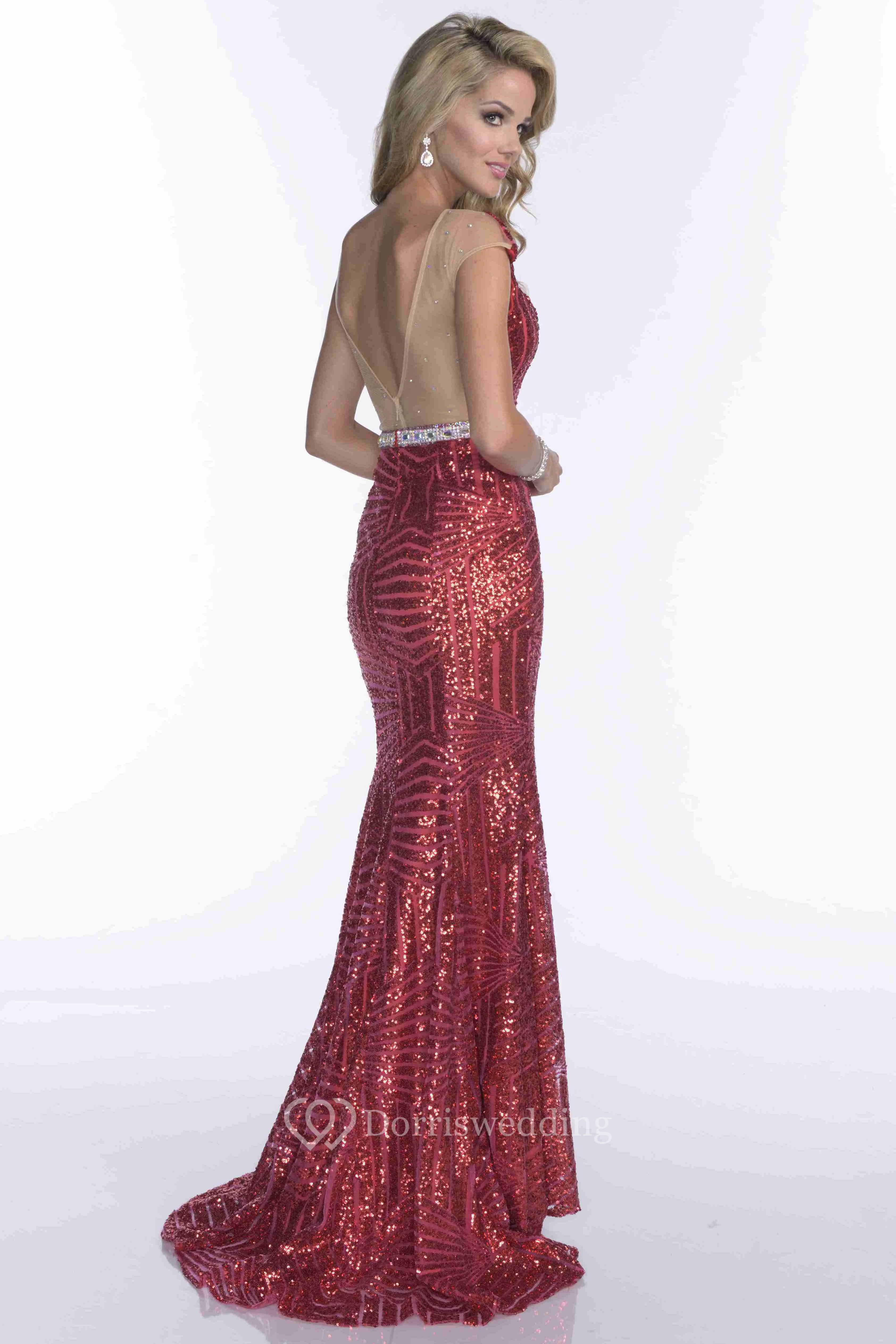 Side Slit V-Neck Cap Sleeve Sequined Prom Dress With Low-V Back
