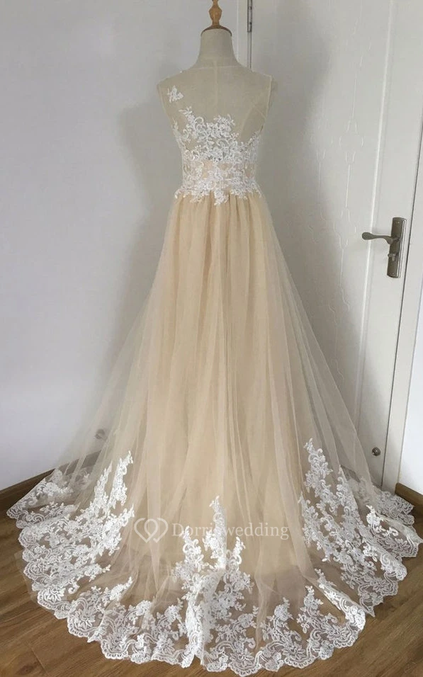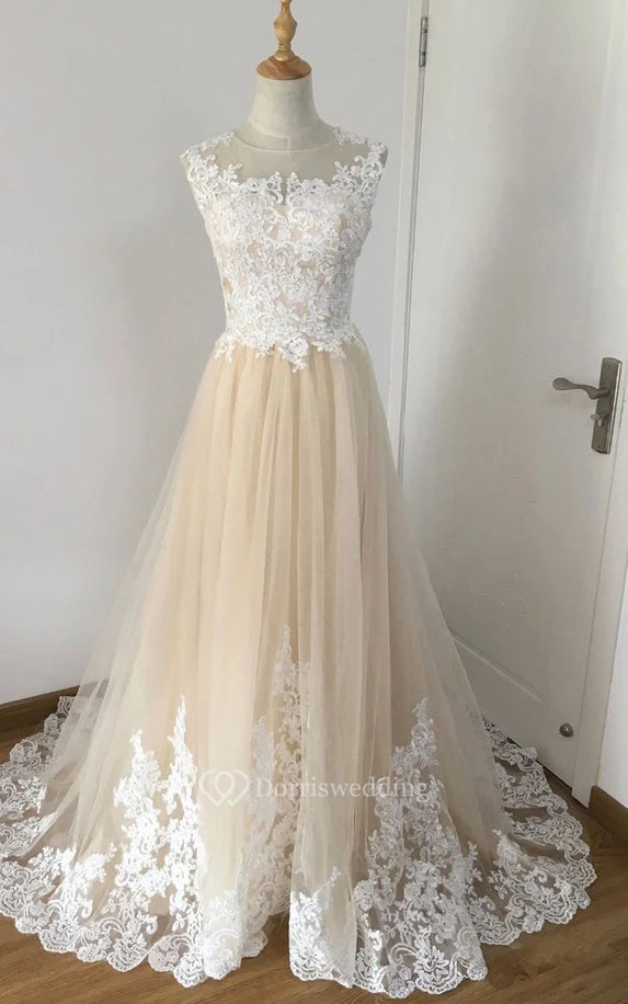Simple A Line Lace Floor-length Sleeveless Illusion Prom Dress with Appliques