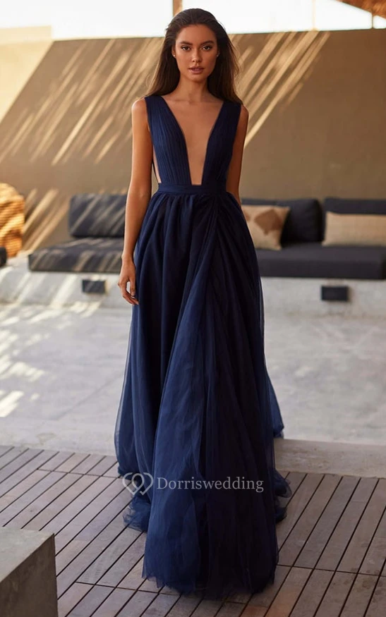 Simple A Line Plunging Neck Evening Dress with Split Front