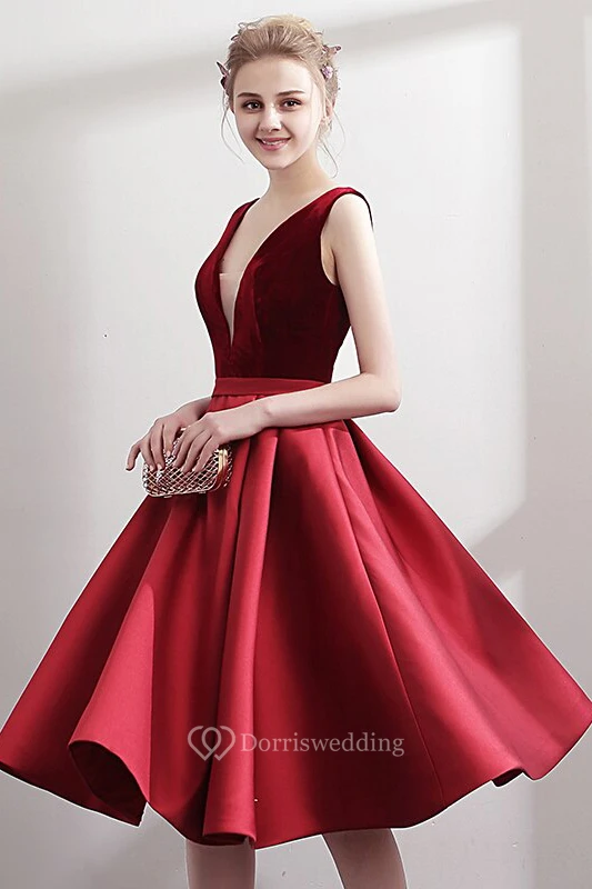 Simple A-line Satin V-Neck Sleeveless Knee Length Dress with Corset Back