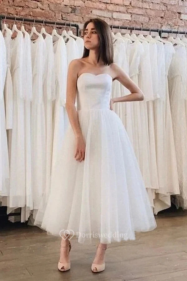 Simple Ankle-length Strapless A-line Wedding Dress with Tulle Skirt