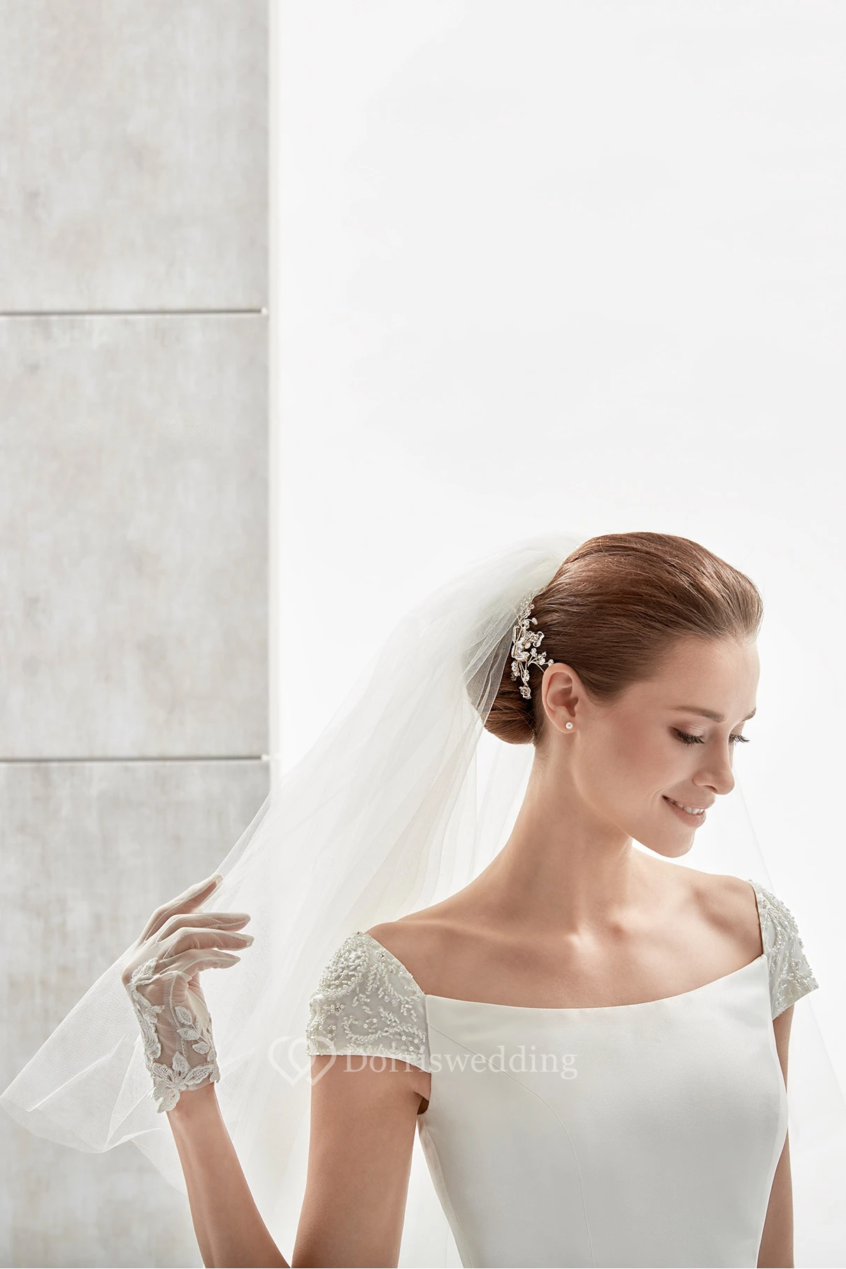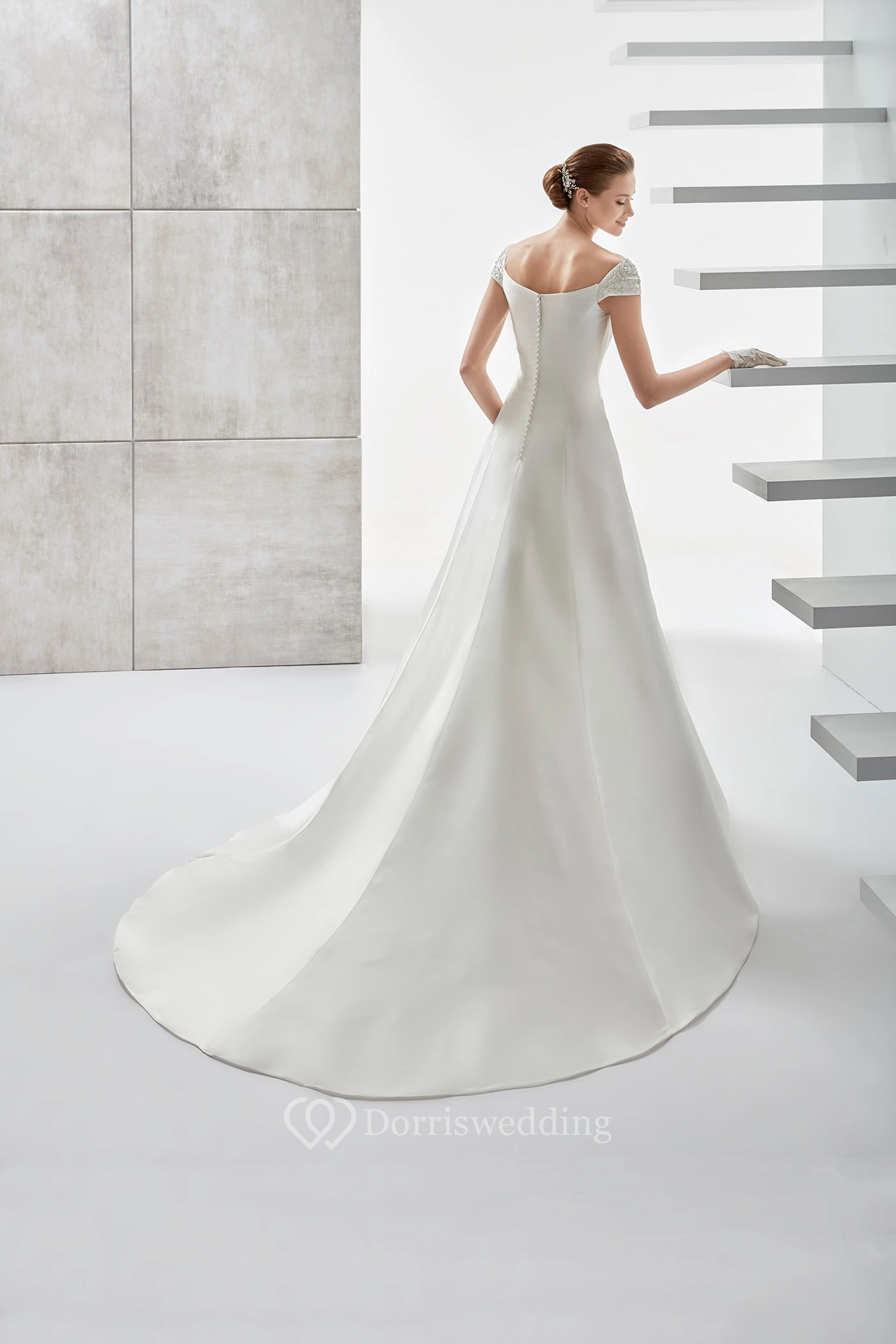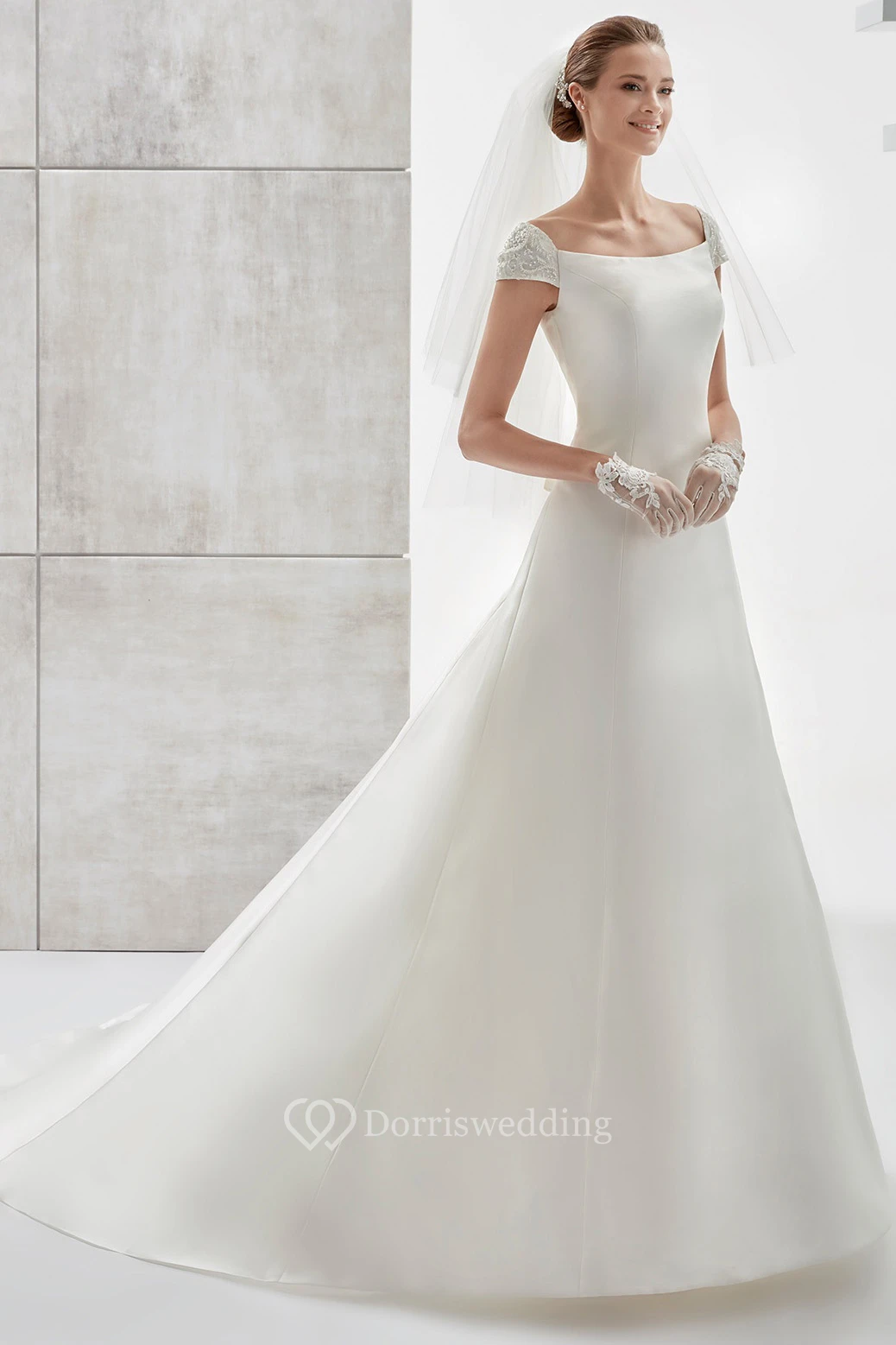 Simple Cap-Sleeve Satin A-Line Wedding Dress With Brush Train And Lace Straps