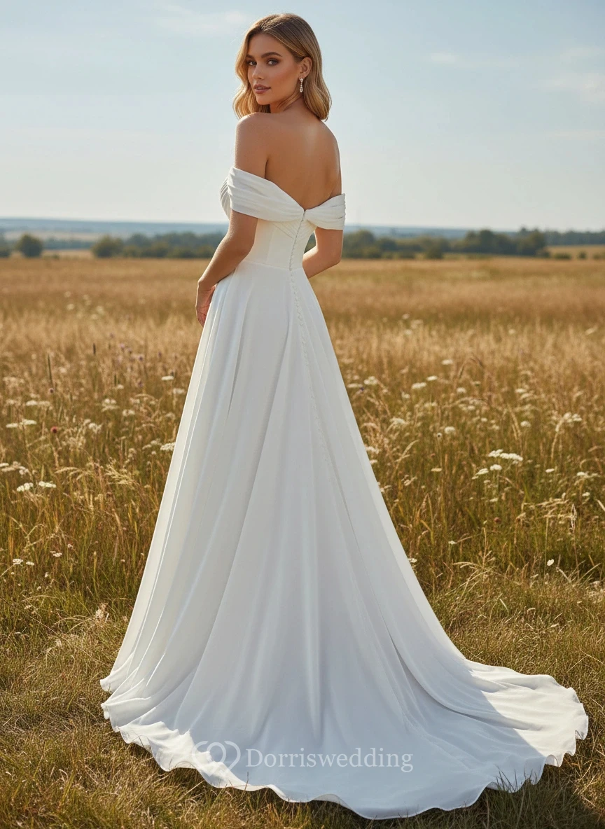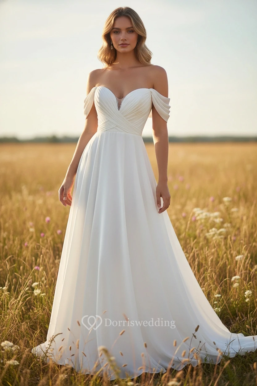 This dramatic ball gown features an off-the-shoulder neckline and a vast, flowing skirt that moves elegantly in the wind. Perfect for a romantic photoshoot in a golden field or a garden wedding, it creates a majestic and dreamy silhouette.