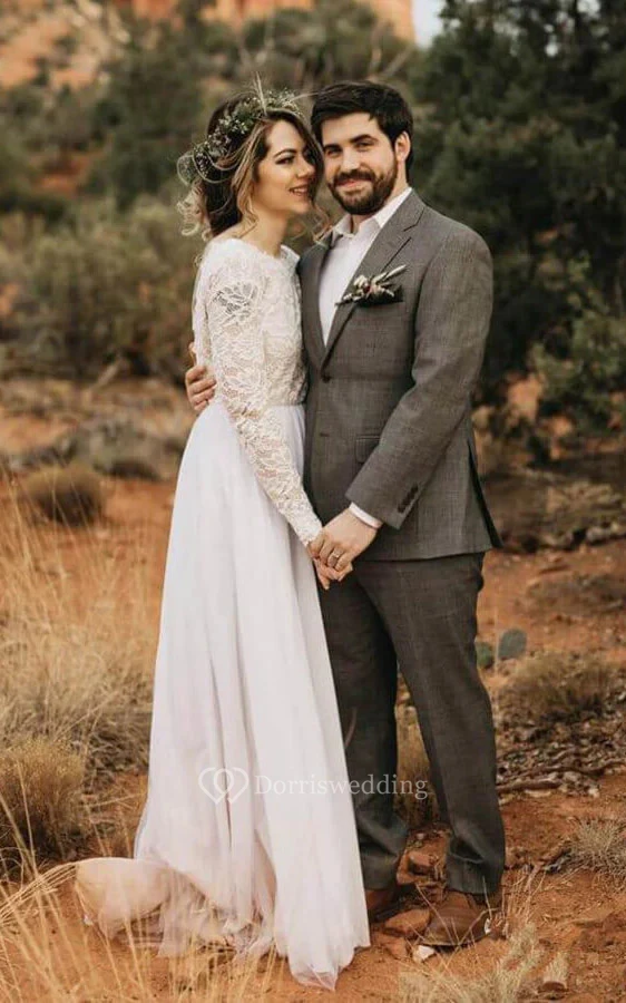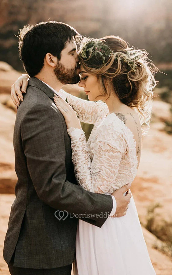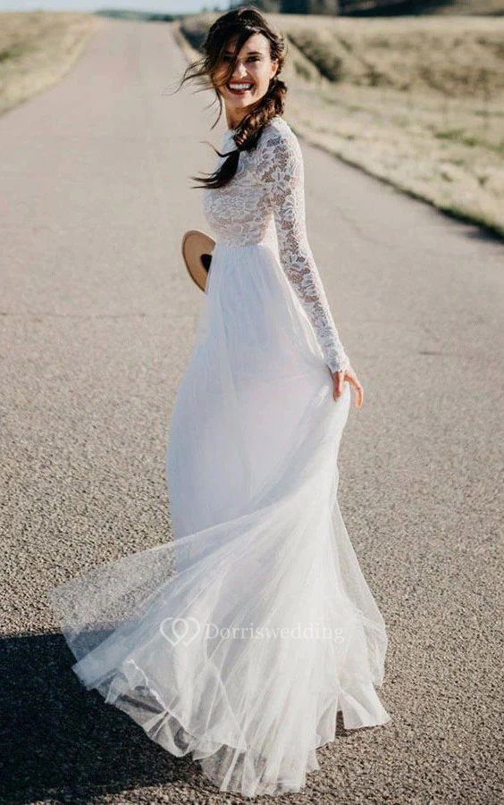 Simple Country Scoop-neck Chiffon Sheath Wedding Dress with Lace Top