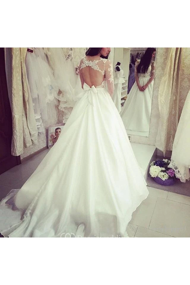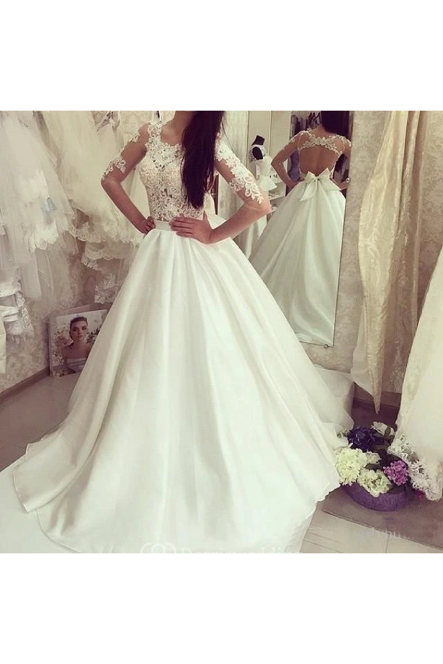 Simple Crew Neck Half Sleeves Backless Lace Wedding Bridal Gown