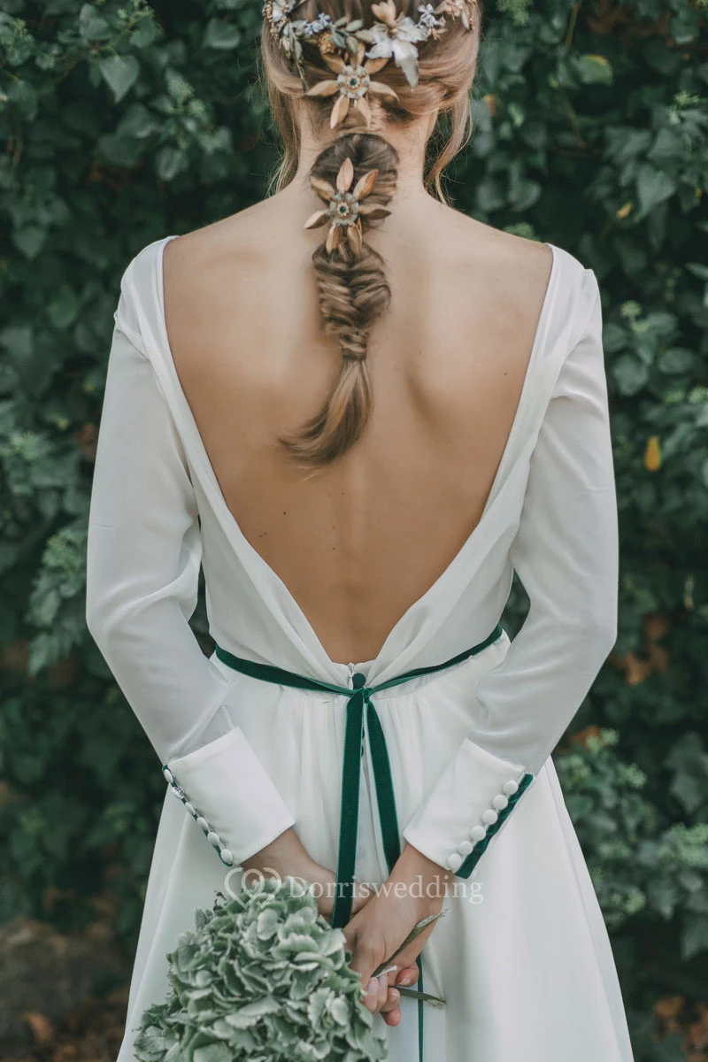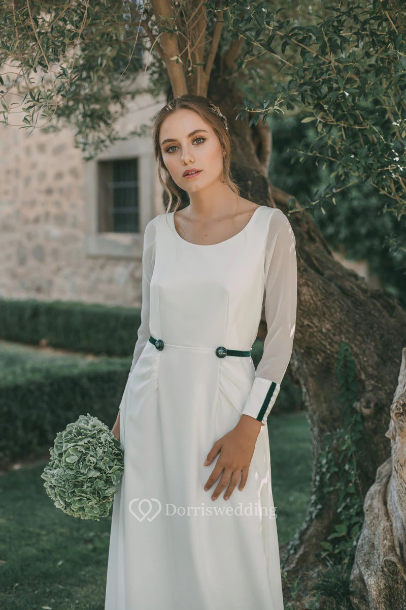 Simple Empire Illusion Long Sleeve Chiffon Sheath Wedding Dress with Sweep Train and Deep-v Back