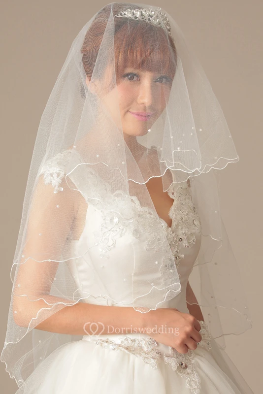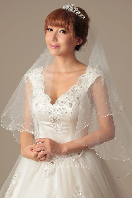 Simple Fingertip Short Tulle Wedding Veil with Beading
