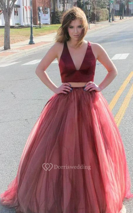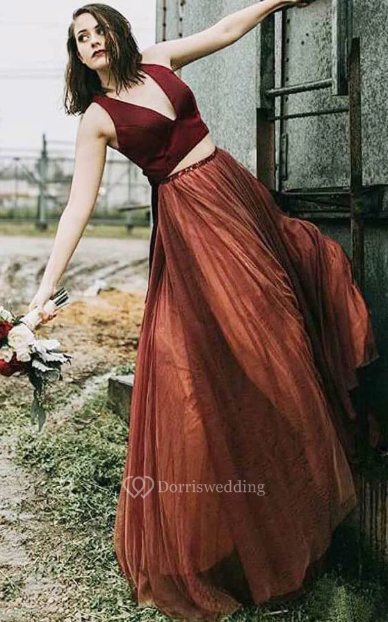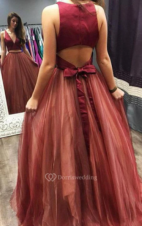 Simple Floor-length Sleeveless Tulle Two Piece Zipper Prom Dress with Bow