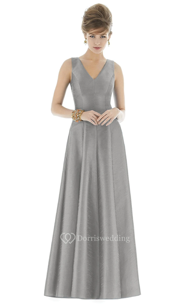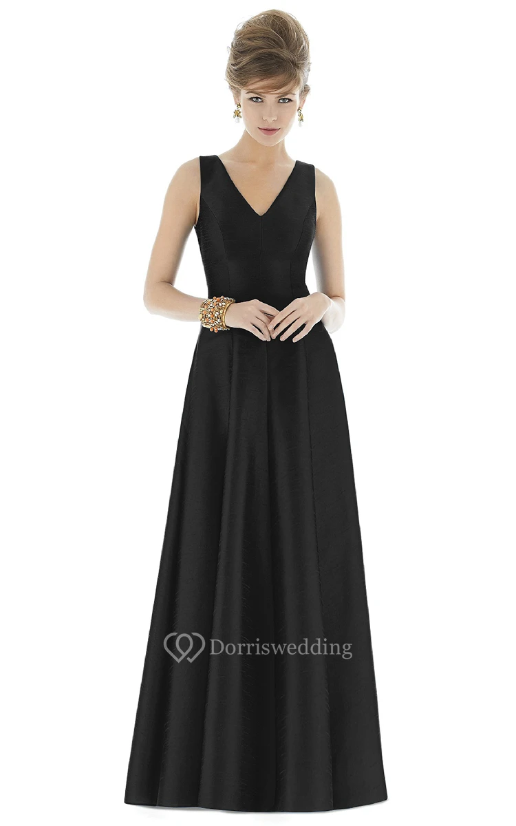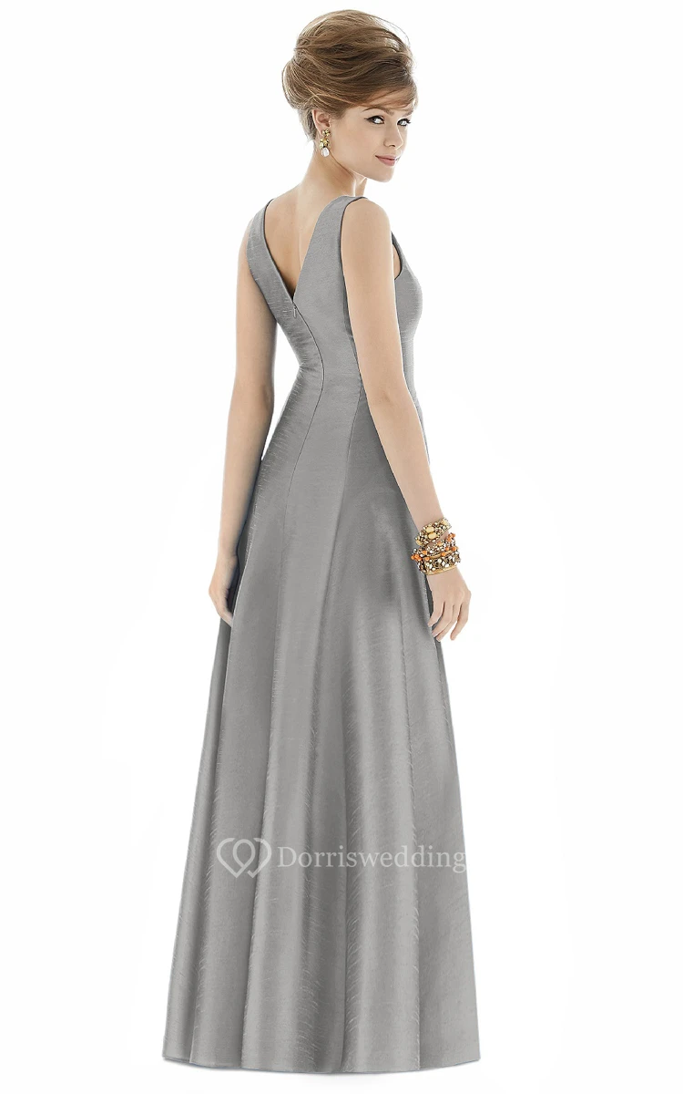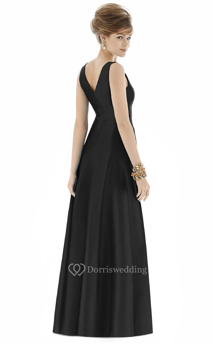 Simple Floor-length V-Neck Satin Gown with Pleats and V-Back