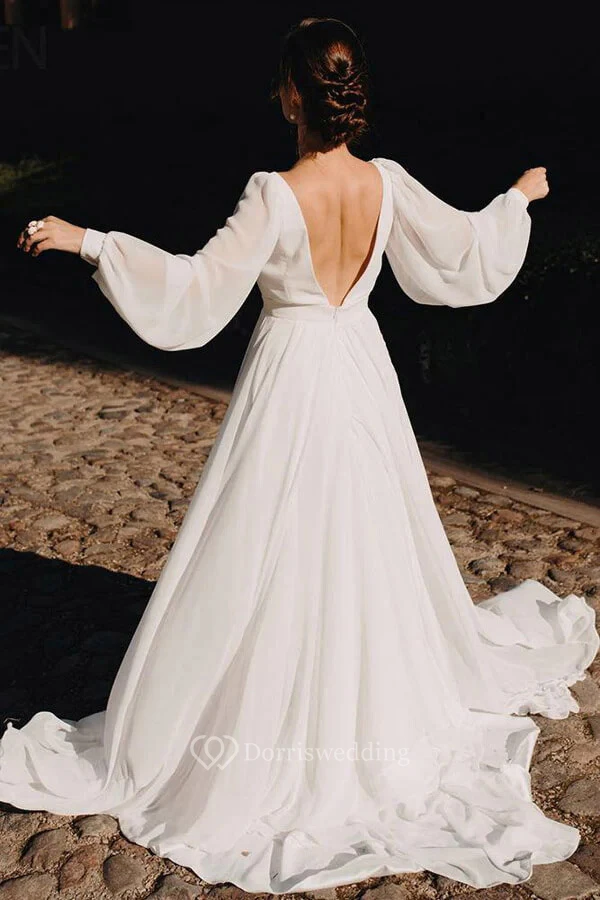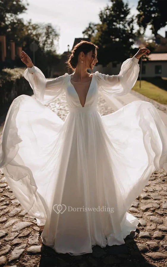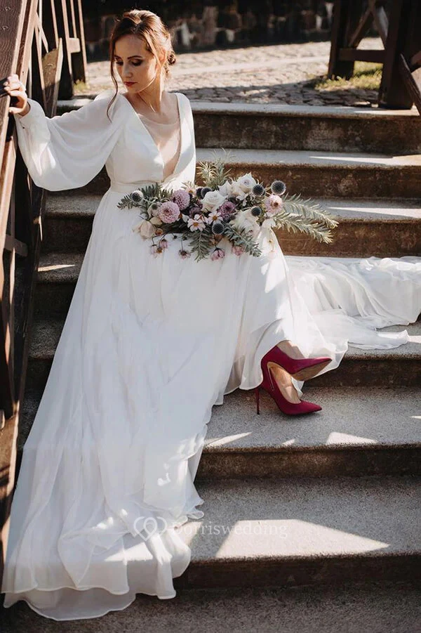 Simple Illusion Plunged Long Sleeve Low-v Back Solid Wedding Dress