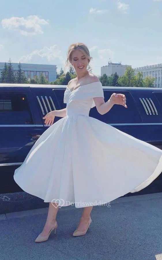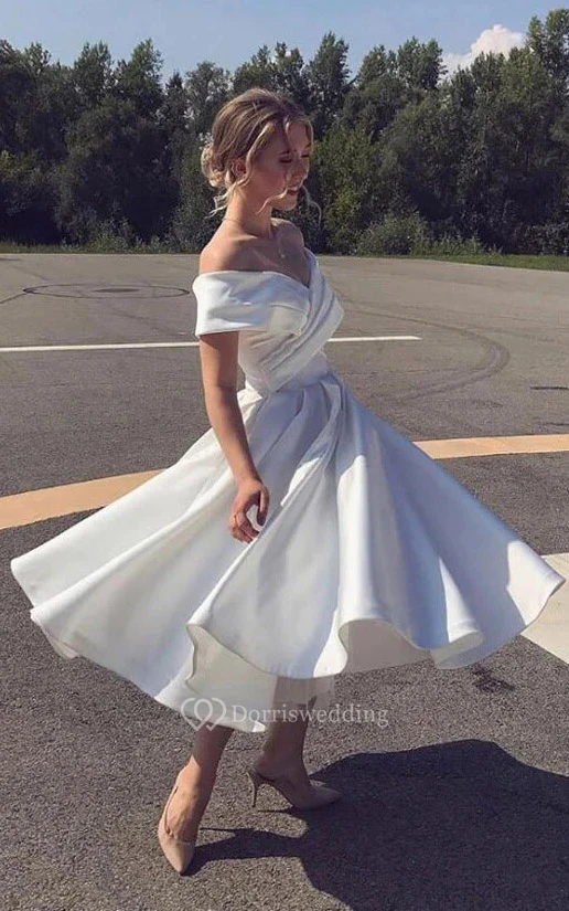 Simple Off-the-shoulder Criss-cross A-line Empire Satin Short Wedding Dress