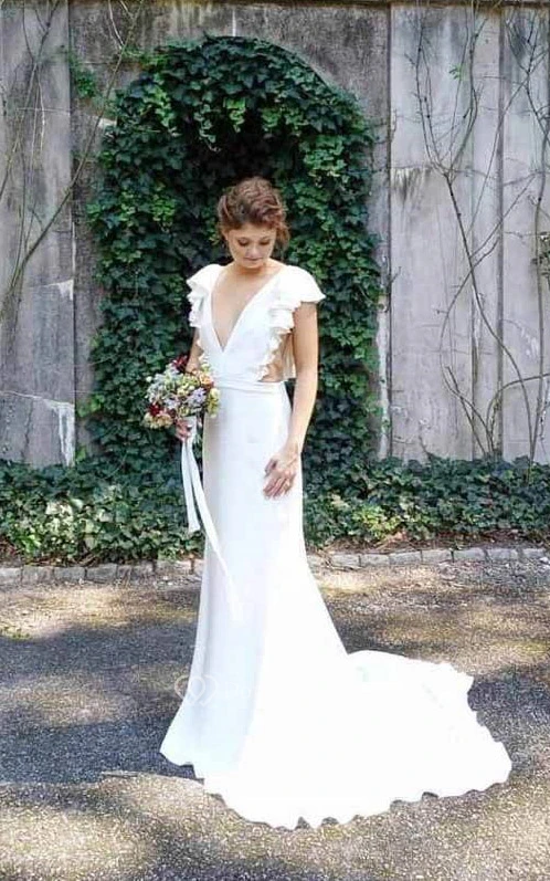 Simple Plunged Cascading Sheath Solid Wedding Dress