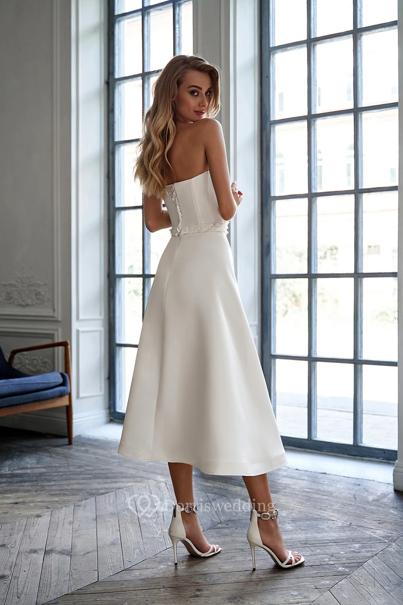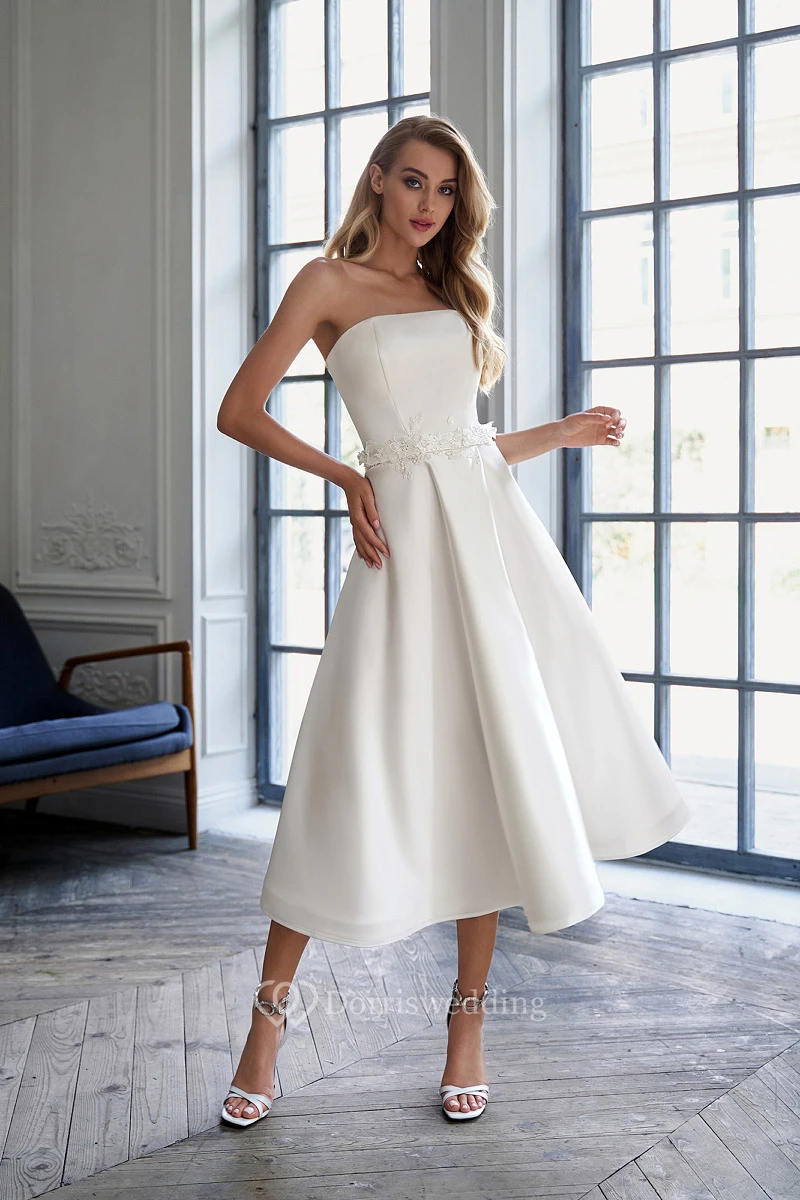 Simple Satin Strapless A-line Tea-length Wedding Dress