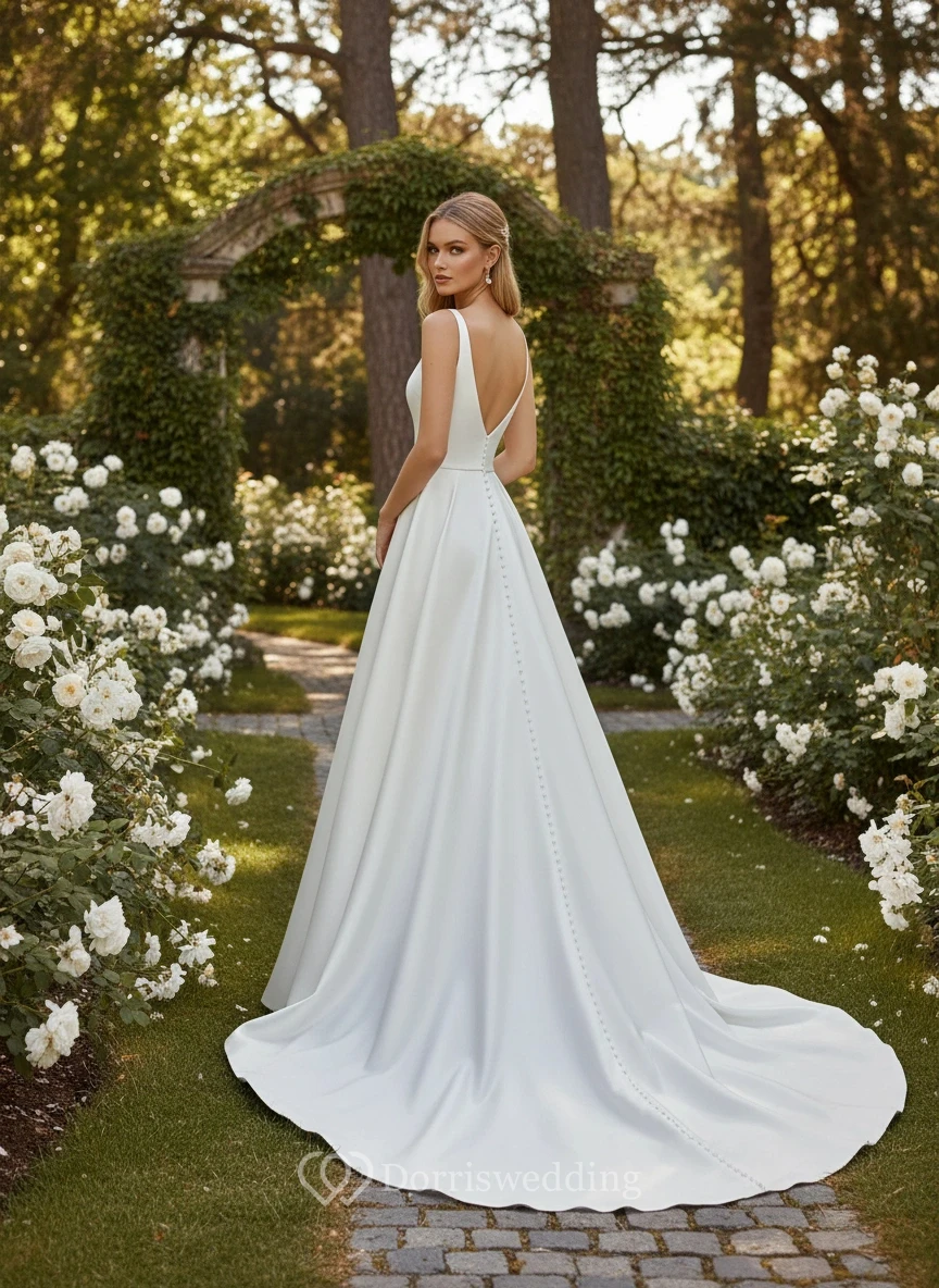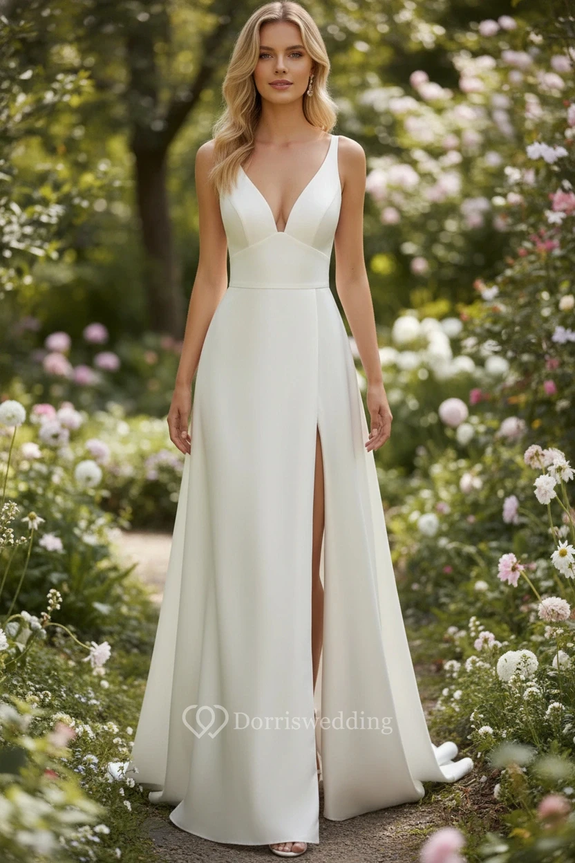 Simple Satin V-Neck High-Slit Wedding Dress