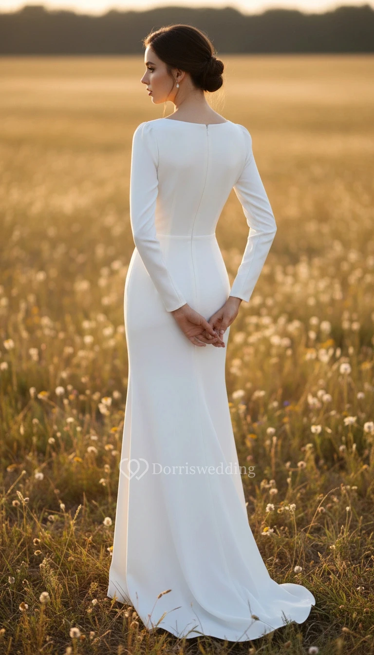 This elegant dress features a V-neckline, long sleeves, and a high slit. The simple design with waist detailing is accentuated by the soft backlighting, making it ideal for a sunset ceremony in a field. It's both sophisticated and subtly sensual.