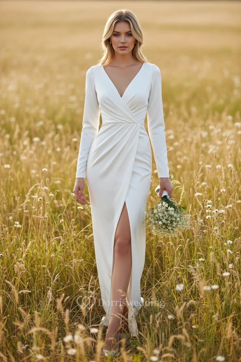 Simple Sheath V-Neck Long Sleeve Slit Wedding Dress