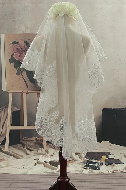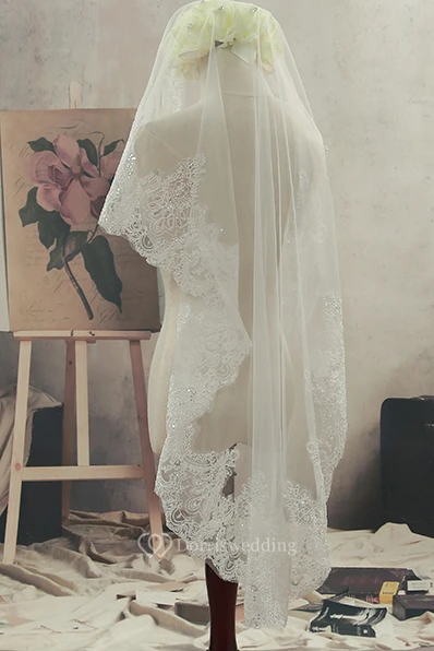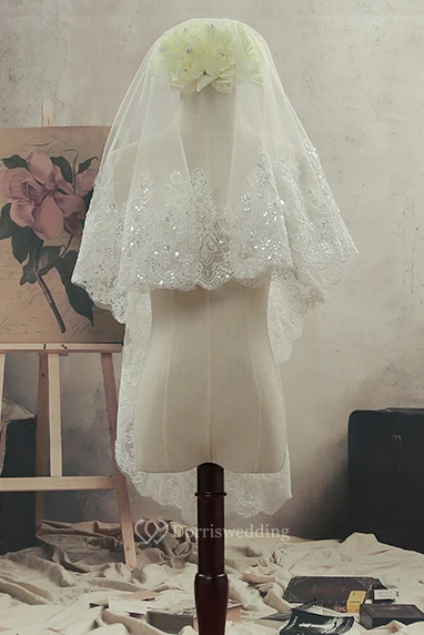 Simple Short Fingertip Tulle Wedding Veil with Beading and Lace Edge