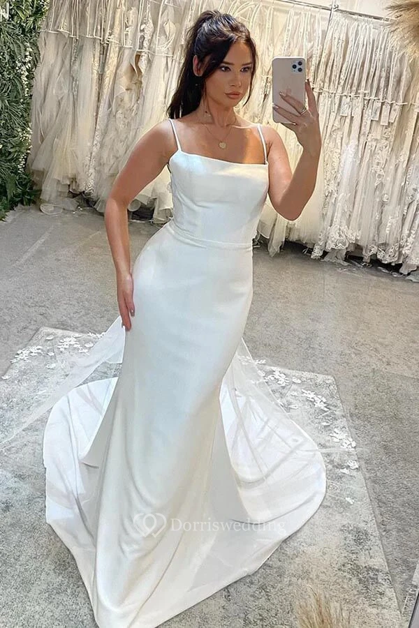 Simple Spaghetti Sheath Satin Wedding Dress with Tulle Watteau Train