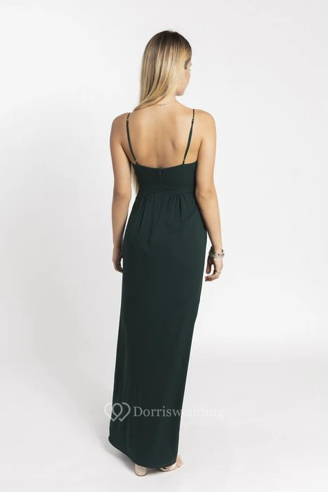 Simple Spaghetti Straps V-neck And Open Back With Front Split Bridesmaid Dress