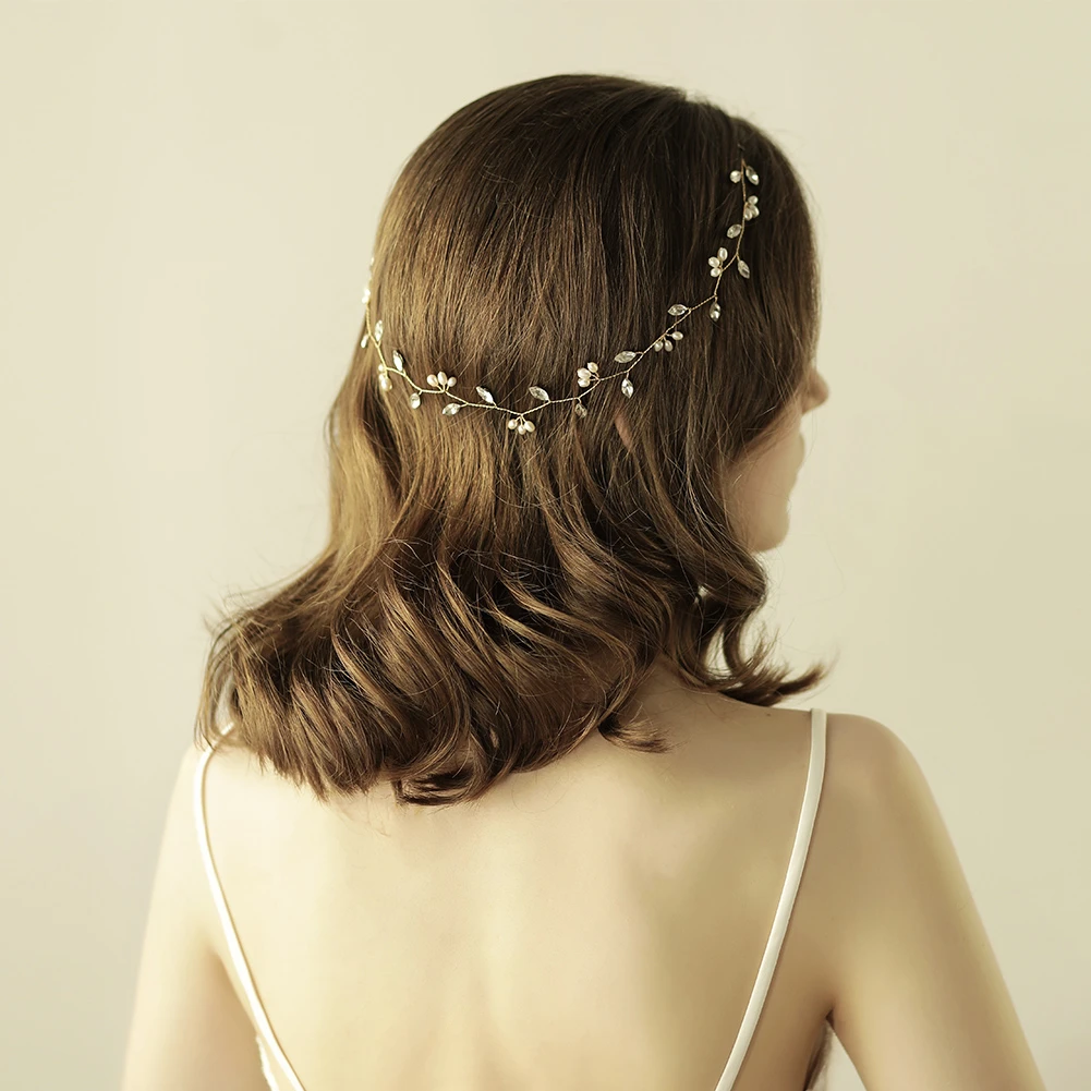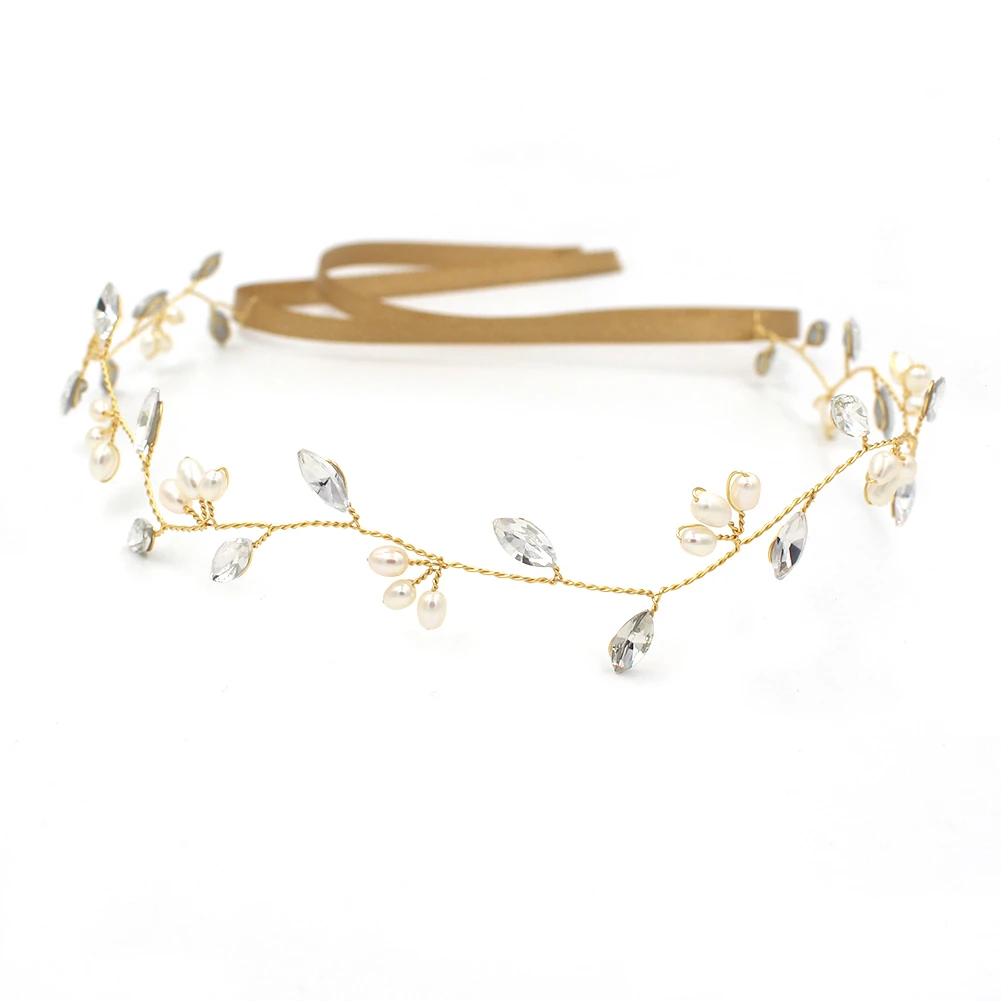 This headpiece features transparent rhinestones, ivory beads, and a gold-toned wire base and matching ties.